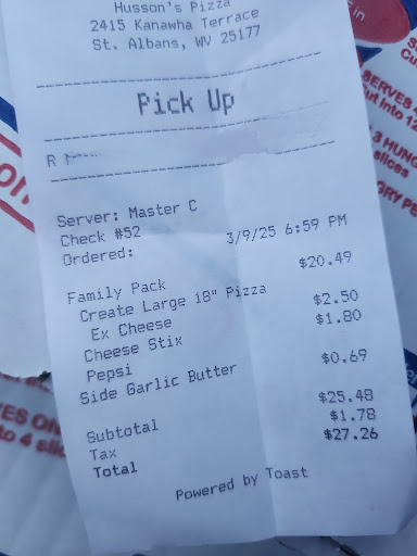 Read moreI have ordered from Hussons for over 35 years & they stay consistent and very delicious! We would go for lunch when I went to High School & have the greatest time! Now as an adult we order all the time for pick up & delivery! I will edit more as I get more different options. We had the dozen naked wings with ranch & the Largest Ham & Pineapple Pizza! Always a kind delivery person & may I add that steam was still coming from our food 5 minutes after we opened the boxes! Wings were super hot I couldn’t touch them! Amazing pizzeria! We love the owner & his family! Great small...