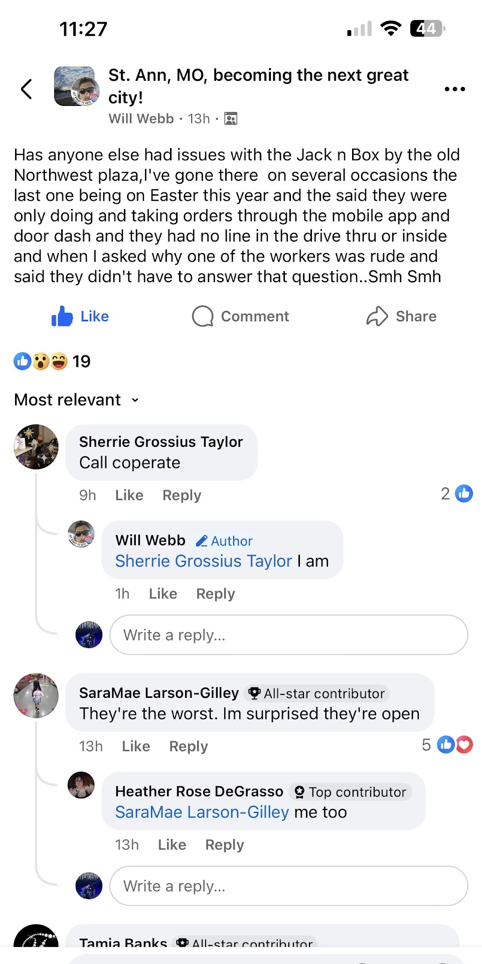 Ā Ā Ā Read moreApparently All sales are final at this location even if it's not what you ordered. I placed a order for a number 4 with large curly fries a chicken sandwich and a bacon swiss butter jack . I have tried the butter jack on 2 other occasions the first was at a different location and in my opinion it was one of the best burgers I've had from a fast food joint the second butter jack was purchased from this location on a different date and to my disappointment was barley edible with its stale buns crunch softened only by the run off of gease in its soggy burger box. Because of my fist experience with the fickle butter jack burger I was willing to gamble on a 3rd try and I crapped out! When I finally got my bag after paying for my order and trying to add 2 Resses pies to my order at the window after seeing it advertised at the widow but not on the drive thru menu I'm told no add ons at the window well ok I should have seen that as a sign of the tides so to speak but I pull up to the curb as asked to wait on my order for what turns out to be another 8 mins when it finally gets there it check my bag to see 2 tacos or something closely resembling tacos a smashed sourdough jack and my number 4 with cold curly fry . I go back through the drive thru and let them know my order is wrong I'm instructed to bring it to the window I pull around had the lady the bag with the items I didn't order and prepare to wait some more for my correct order the jack in the box employee then comes back to the window and tells me when she gave me the bag all the food was in the bag and she knows what she put in the bag so after being called a liar over a chicken sandwich and buttery jack Wich all things considered if I actually received it most likely would have been garbage I'm not feeling like jack in the box any longer and I request a refund another jack I'm the box employee comes to the window and says I won't be getting a refund and she is not allowed to take my food back like her fellow employee just did and closes the window in my face I sit there a good while waiting to see if she is seriously not going to give me my money back she just stares at me trough the window until 13 minutes later 6 st ann police officers speed onto the lot to inform me that the employees can not give me a refund ....