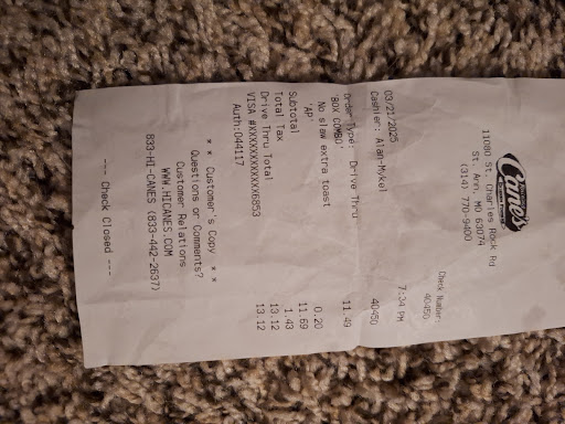 Ā Ā Ā Read moreWhen do they ever do anything right? Iāve visited this location a total of 4 times and itās never right. I didnāt have any plans on complaining/writing a review but at this point itās ridiculous. Last night I ordered a kids meal, they forgot my sonās canes sauce, like how do you forget something that comes with the meal??? A few weeks before that I paid for a 4 finger combo and they gave me 3 fingers!!! The time before that I ordered a 3 finger combo and not only were the chicken finger so dry and crunchy to the point that there was NO MEAT inside but they forgot my toast! And another time I went here and ordered the box, 2 extra tenders and a kids drink for my son. They rang me up for an extra kids meal, box combo and an extra kids drink. When I told them about the mistake they asked if I could leave the drive way, park my car and come inside while itās raining! Absolutely HATE THIS...