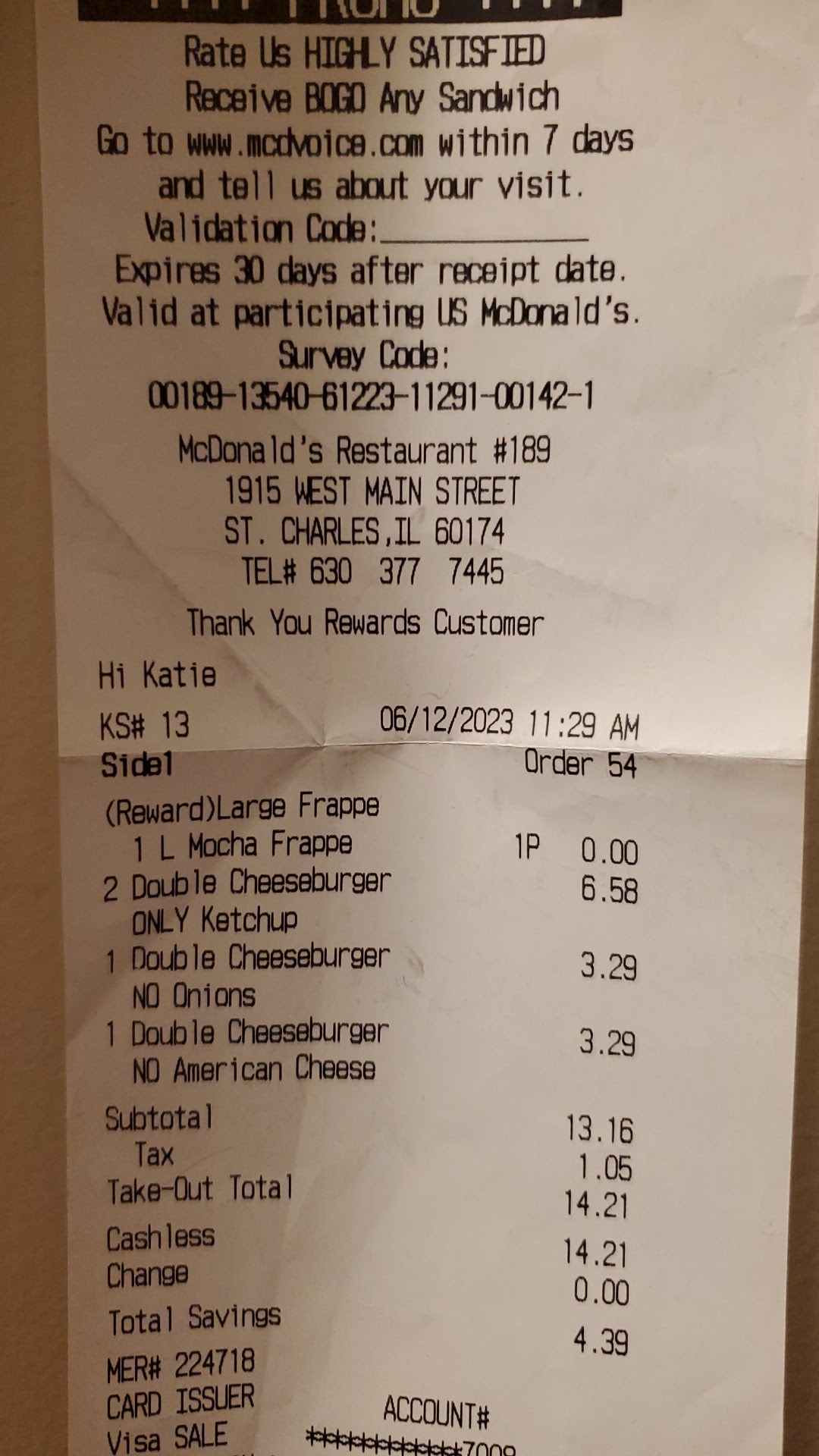 Read moreI have frequented the St. Charles location for years and quite often the experience is good and they'll just goof up little things like the wrong sauce for my nuggets or something. But 3 weeks ago, June 12th, they completely messed up my order for 4 cheese burgers, we noticed on the screen and asked the guy at the window to double check and repeated the order, was assured it was correct and it was not, who orders a double "cheese" burger with no cheese?! And one was just supposed to be no pickle but got onions only even when the receipt said "no onions." We called but I didn't realize till we had driven off because I was on my way to work, and was told to come back later no problem. However, since they screwed up a previous order a month ago, and I had "done this before," the supervisor called back and told me they'll send me 2 meal vouchers in the mail and took my address. I think 3 weeks is ample time to send something less than a mile. I don't call 99% of their mistakes unless they forget an item, and I was made to feel like I'm complaining just to get free food which is not the case. I would've gladly brought back those wrong burgers for what I actually ordered after work but was promised compensation so I didn't. Like I said, usually my experience is ok here, but this one has definitely helped me decide to eat from...