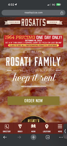 Read moreI just got off the phone with this Rosati's. If I could give them zero stars and still leave a review I would! This man was the rudest thing I ever talked to. I called up and politely asked if they were open because it is Easter, and the gentleman who answered the phone said ..."I answered the phone didn't I!" Unbelievable unprofessionalism!! I was so taken aback! I caught my breath and said, well I just called because some pizza places were closed on Easter, but not everybody celebrates Easter so I didn't know if you'd be open. Then he changed his tune and proceeded to tell me that all the hours were normal and they still were delivering, which I did not ask! I would not purchase a piece of bread from this Rosati's! If you're going to be rude to your customers from the get-go, you don't deserve to be in business! I have been purchasing from Rosati's for decades, and never encountered one like this!...