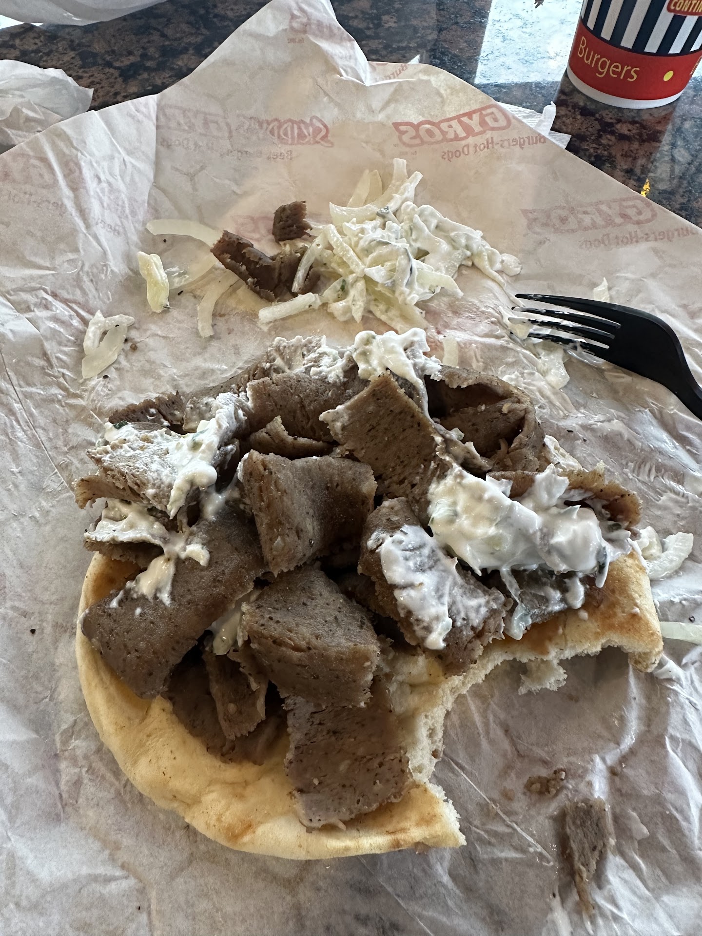 First time at a Skippy's, we did dine in. First impression upon walking in was there was nobody in the parking lot but yet there were tables that were dirty and still had empty food bags and drink cups on them, simultaneously as a bus boy was walking around wiping down empty tables which made no sense but ok, walked to the counter to order. The guy who took our order was really nice and friendly, which was great. I jumped around the menu as I have never been to this establishment before and got a gyro, Chicago style dog and mozzie sticks, which after he told me my total I had to do a double take because I didn't realize that they're prices are a little steep.....(my wife got her usual which she loves so I'm only rating my food and experience). We ordered it for dine in but it came in to-go bags. First off was the gyro, it was great! Full of flavor, cooked well, heavy portion of meat which is a plus in my book, onions were fresh and the tszaziki sauce is actually really good. I downed that no problem, no complaints at all on the gyro. The dog, was cold and terrible. Could barely taste the dog, bun was falling apart from sogginess and it just overall was not nice, hard pass. The mozzie sticks, were good. The marinara , was a watery mess. So overall from what I had I'd recommend the gyro and that's about it. But I'll also be going back and trying some more of the menu, and I'll update...