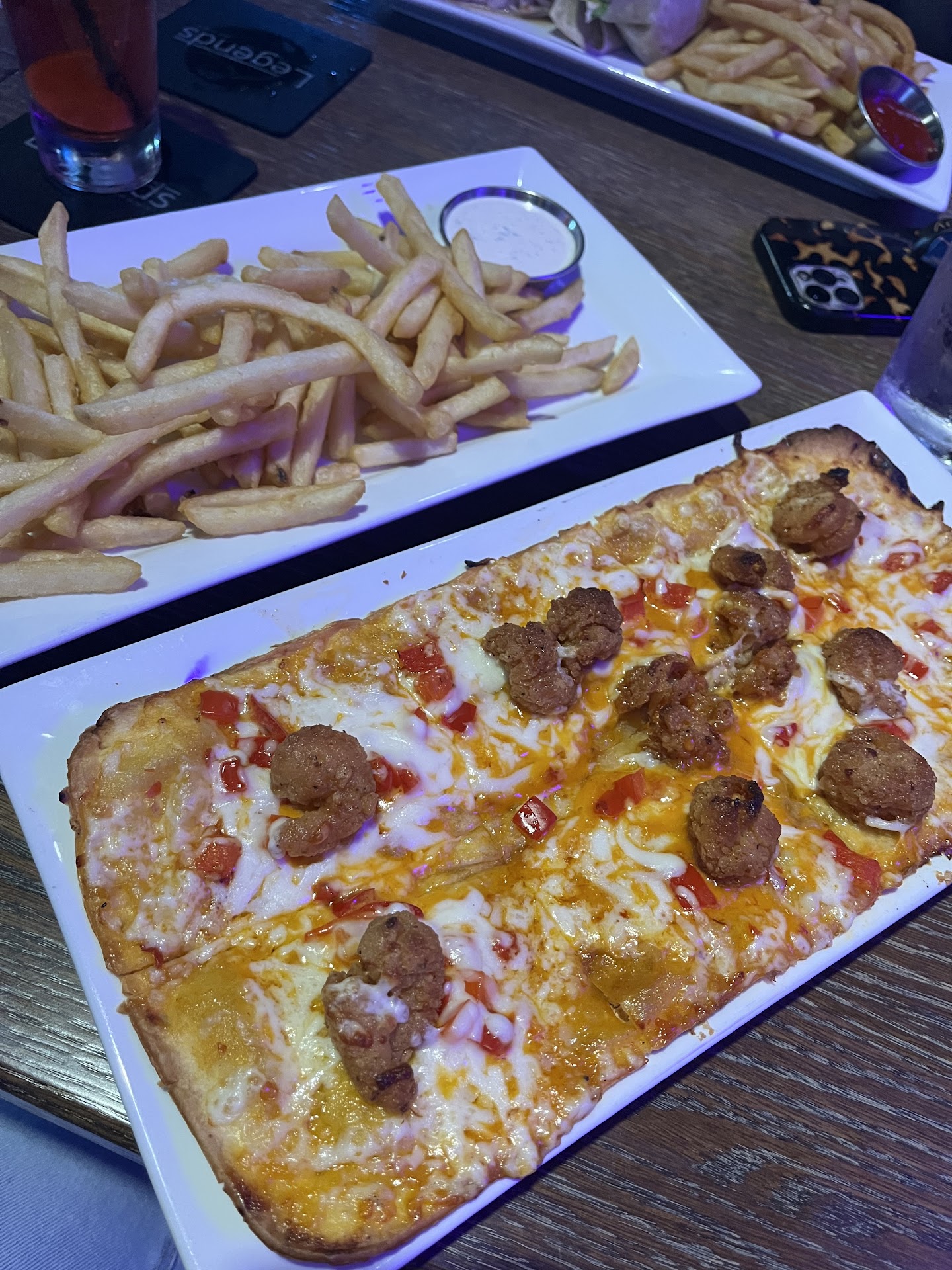 Read moreWas very excited to try the revamped Legendâs. Unfortunately, the experience was not great. We visited during happy hour on Friday, September 22nd. We were seated and told by a waiter that he had a party of 20 coming in and âprobably shouldnât take our tableâ but would because the other server was late. Within a few minutes, a waitress came by and asked what we wanted to drink. I asked what the rail vodka was and the waitress stated âIâm not sure, I think itâs Bacardi.â Understanding that she clearly didnât know, I just told her rail would be fine. Another in our party asked about the Bloody Mary and the waitress stated some people didnât like it due to it having sweet and sour in it. Not sure what she meant. Another person in our group asked for a vodka Red Bull and asked if there would be any up charge for Red Bull during happy hour. The waitress stated it would be âlike a dollar more.â She had 2 vodka Red Bulls and when the bill came, it was $3 more per drink. Before we ordered food, the waitress stated they were out of wings (which was advertised on the happy hour menu) and the turkey club sandwich. Two of us ordered the boom boom shrimp flatbread. Mine came out first (pictured), we were told the other would be out in 5 minutes. 10+ minutes later it came out and had cabbage and green onions on it (as it was advertised on the menu.) The waitress apologized and said she could bring a side of cabbage and onions. I declined. Another in the group ordered the smokey chicken flatbread, it came out missing the chicken. Very unfortunate because the menu has a lot of great looking items and the atmosphere and space is awesome. Hope they can work on training their employees...