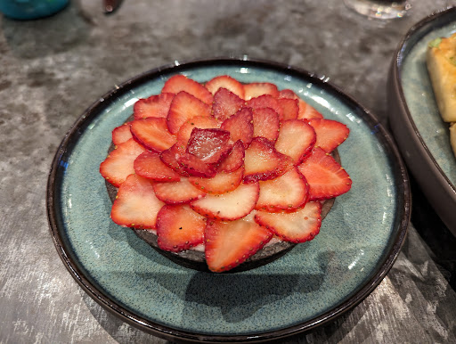 We ended up ordering the chicken sandwich, farmers salad, flat bread, strawberry tart, and a pumpkin latte (seasonal). The sandwich and salad were both excellent but the flatbread was a bit thick and chewy and thought both the tart and latte were good. The tart shell was a bit tough to bite through but the flavor was good and the latte was just missing something, maybe some nutmeg or something that would have made it...