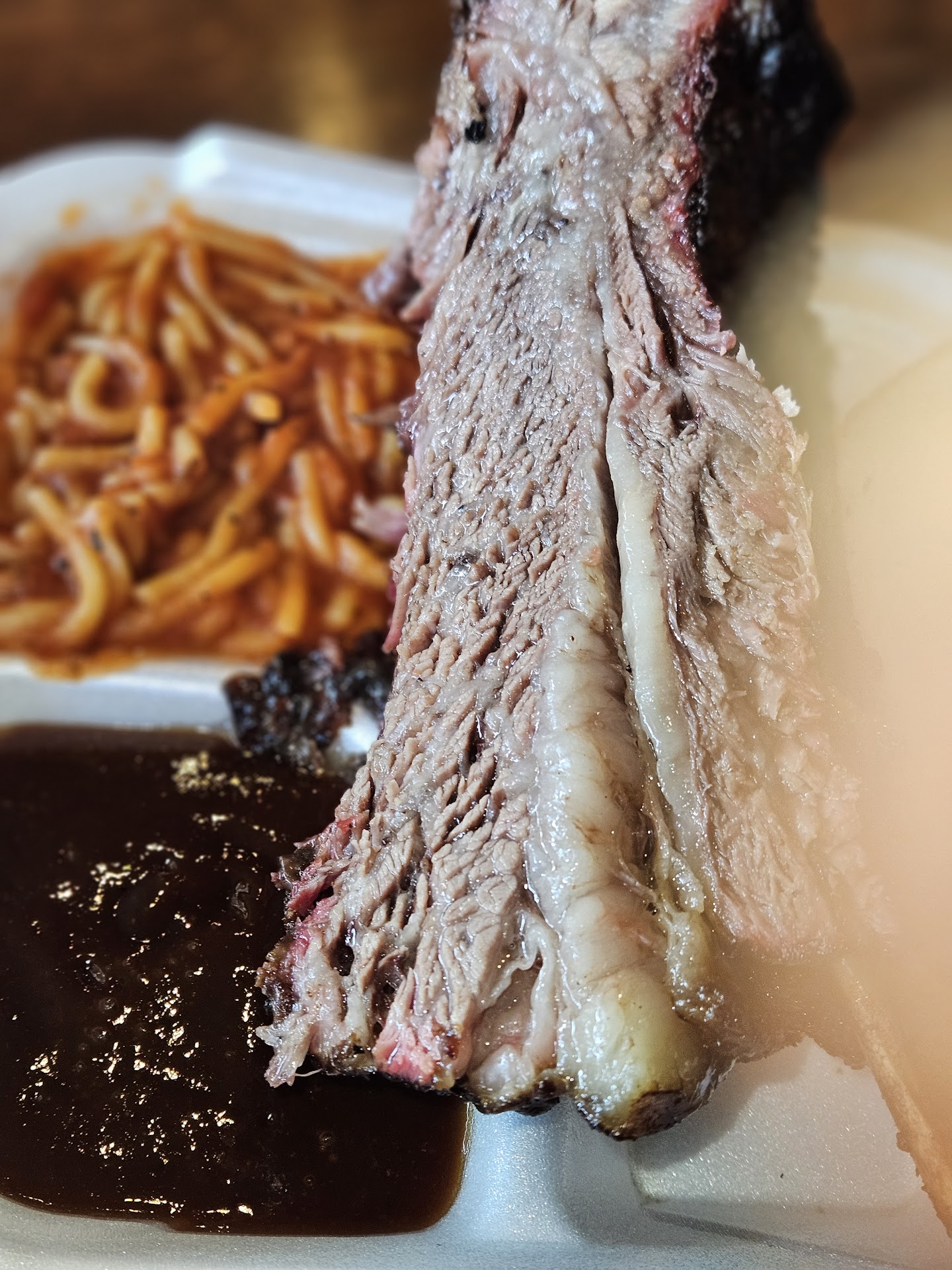 Then came the ribs â and letâs be clear, these werenât regular ribs. They looked like dinosaur ribs â huge, impressive, and downright mouthwatering. Despite their size, they were tender and flavorful, falling right off the bone. The sauce tied everything together â a perfect blend with just a hint of sweetness that complemented the smoky flavor perfectly.
