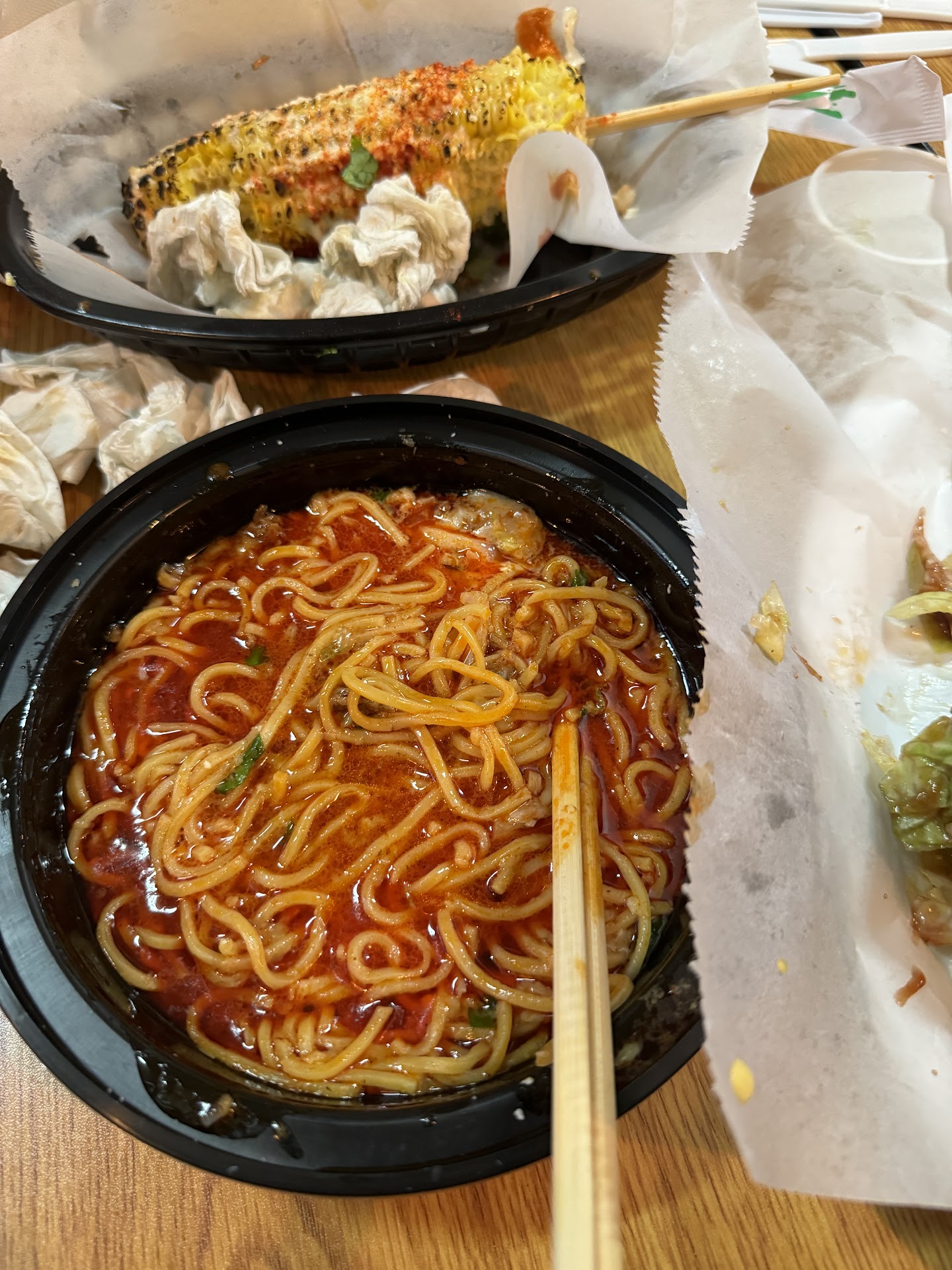 The BBQ burger was unremarkable, excessively messy, and soggy. The birria ramen was excessively greasy, making it impossible for me to consume more than a few bites. Even the elote was unexpectedly sweet and disappointing.