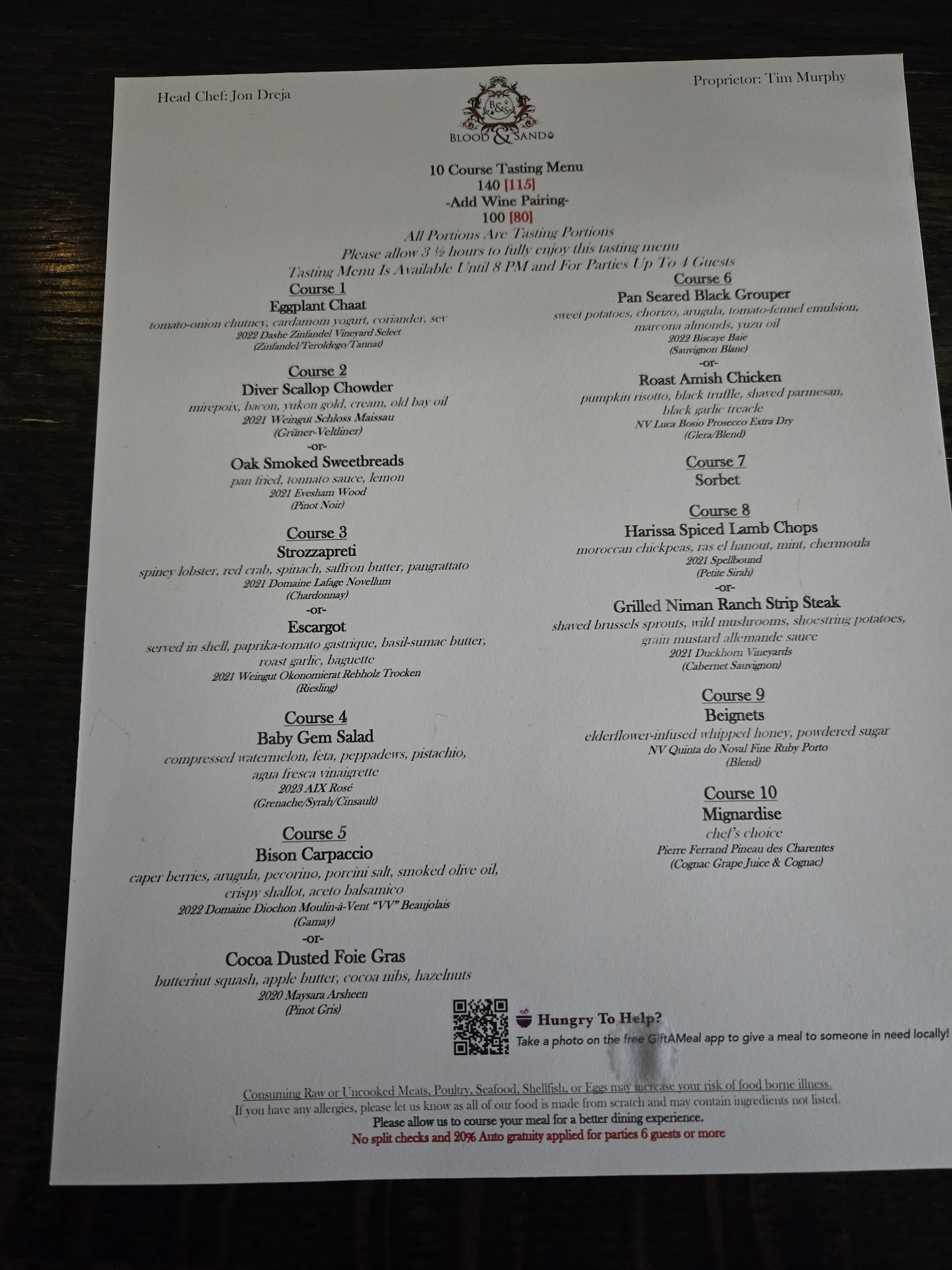 Read moreToday we went to Blood and Sand to celebrate our 11th anniversary. They had a taste menu and we are so happy that we went. Each of us had the 5 course meal and they had a variety of options to choose from but they are not the traditional dishes you’d get in any other restaurant. In order to have the most out of this experience, we decided as we were recommended by our server, get different dishes for each course. Before we even started we were offered their tots with cheese and truffle. We loved it. And it was served with their in house French dip. As well we had a bite of their own tortilla chip topped with venison meat and corn tomato and more yummy glaze. For starters I got the kangaroo tartare topped with quail yolk and on the side they had anchovies butter. Even though it might sound crazy but it tasted great. My wife got went for the safe choice and got pan seared panisse “chickpea” with vegetables. Second I got the bib lettuce salad that had lobster, cucumber, watermelon, granola and lobster vinaigrette. It was just amazing all the flavors worked great together. My wife got Pho Bo soup that had wagyu beef brisket “yumm” beef meatball “more yumm” rice noodles onions and ginger. That was one of the top dishes we had. Third, I got confit octopus that came with lentils and mbaongo sauce and pickled chili. That too came on the top of the list. She got the Sears duck breast with corn edamame scallion pure and black apricot Demi. Fourth, “at this point we are getting full, we thought we won’t be filled because of the portions but we were mistaken” I got the cocoa powdered elk chop with stone fruits (