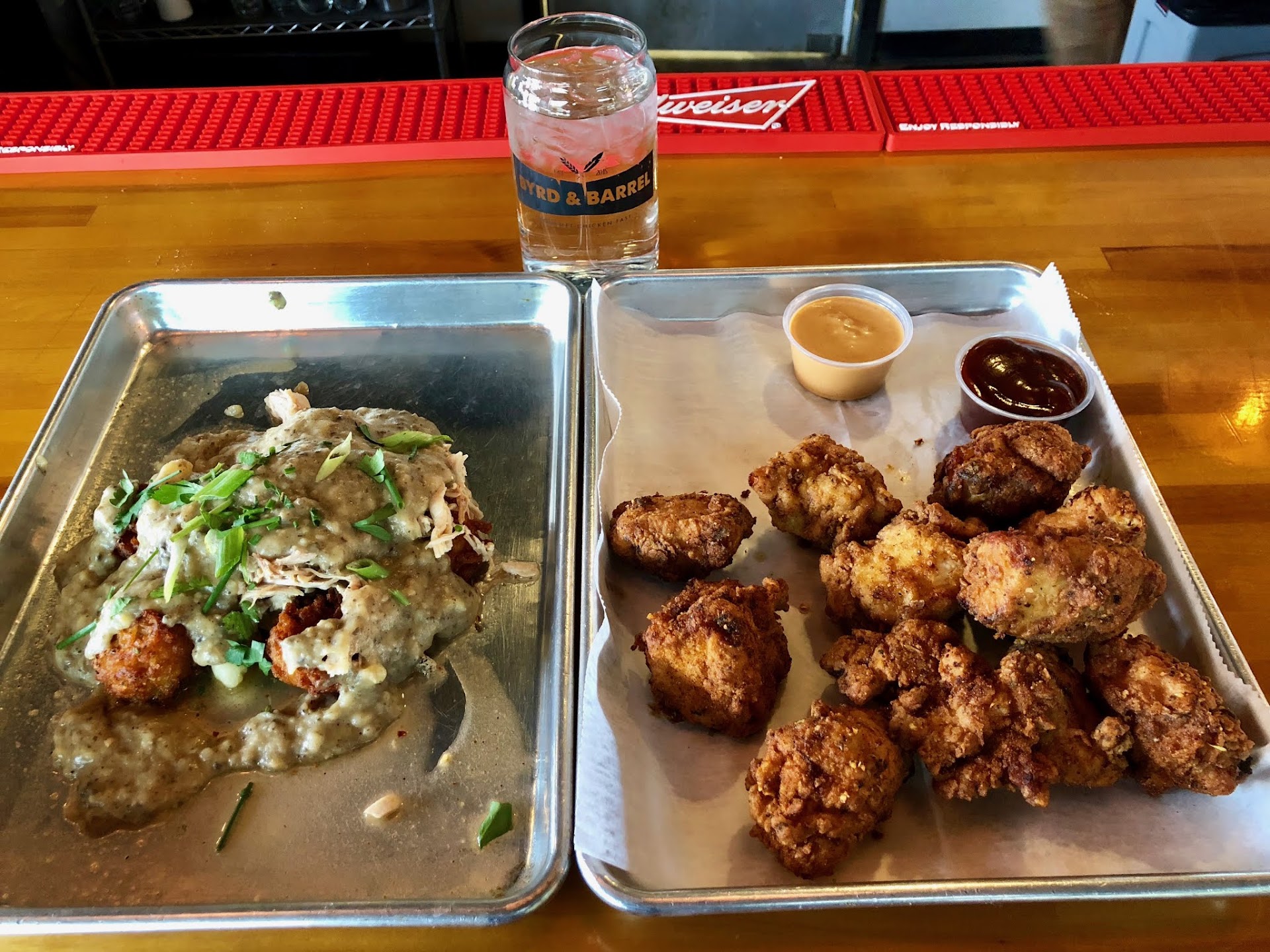 Lastly, a message to all the morons who rated this place 1 or 2 stars: It's GOURMET chicken. If you want to fill a soggy box with as much disgusting food as $3 will buy you, then go to Church's Chicken or KFC. There are plenty of them around St. Louis. To eat the meticulously prepared, fine-dining level food at Byrd and Barrel and then moan that it cost you $9 is absolutely ridiculous. If this place opened in the Central West End or Clayton, they could serve this same exact food you're turning your nose up at over the price for $20/entree all day long. The fact that they chose to reside deep in south city is a favor to your palate. You don't know how good...