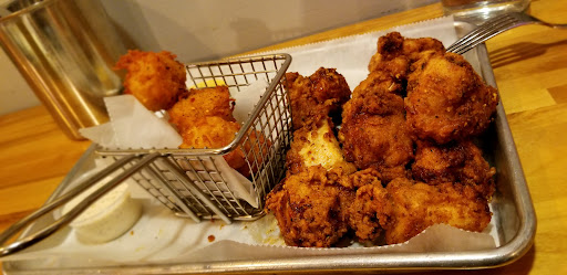 Read moreThe waitstaff were wonderful, the atmosphere nice, the cauliflower appetizer was to die-for, the cinnamon & sugar beignet was good, but the Clucker sandwich was not satisfying at all, because the piece of chicken was so overly deep fried that it was dark brown and just tasted burnt and the chicken was dry and without flavor, the tater tots were the exact same way, and both items were so hard to bite into that I was afraid that it might break a tooth, and the ruffles potatoes chips were tasteless as well and the texture that they added was diminished by soggyness. The macaroni and cheese was extremely creamy, and exceptionally mild in flavor and comforting. Cilantro seems to be the "go-to", the sparse garnish on the cauliflower was nice, but the strawberry Cuban whatever cocktail was overpowered with it and there was no real taste of strawberry discernable making it initially different and finally disappointing. Giving you three stars was pushing it a great deal, but the cauliflower appetizer won you two stars, and the third star was for CONCEPT! Your ideas are GREAT, but your cook was too heavy handed with the frying time, for a basically chicken restaurant the chicken was dry, tasteless, and overcooked, and the portion of chicken to batter ratio was mostly batter very little chicken. I really want to like your restaurant, but fried foods are to be golden brown, not the color of a mahogany dresser, and tender not dry and tasteless. Your prices scream excellent fair, but most of your product is sorely lacking. I know this critique is blunt, but it is truthful, and a couple of tweaks is all it would take for resounding accolades....