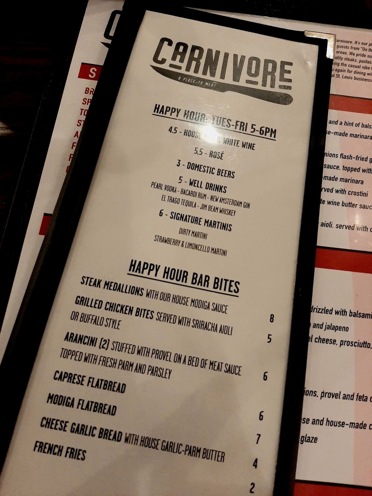 Read moreI literally can't say enough wonderful things about this place - food, drinks, service/staff, atmosphere, all of it! I've been several times and have never been disappointed. They have an excellent happy hour from 5-6pm. The food is delicious and always comes out hot and plated attractively. The arancini and steak medallions can't be missed. The Ceasar salad has in-house made dressing, actual shaved cheese (not powdered/shaker cheese!), and homemade croutons that are perfectly seasoned (and not greasy). If you're looking for a truly good cocktail and not just a typical well with mixer, this is your place. Crafted cocktails highlight a medley flavors and aesthetics. The sugar cookie martini and the chocolate martini (not just regular chocolate syrup in this glass!) were delightful. My tried and true favorite is the strawberry lemoncello martini. The peach old fashioned was a welcomed and tasty twist on a classic. They have a weekly special martini and margarita as well. I would be crazy to not mention the spectacular staff. Your water will never run dry and dirty plates will never pile up. Kind, bubbly, and polite - absolutely on point. Carnivore STL is perfect for a dress-up date night or a casual dinner evening with the whole family. Easily one of the best restaurants currently operating on The Hill, well surpassing others who have been...