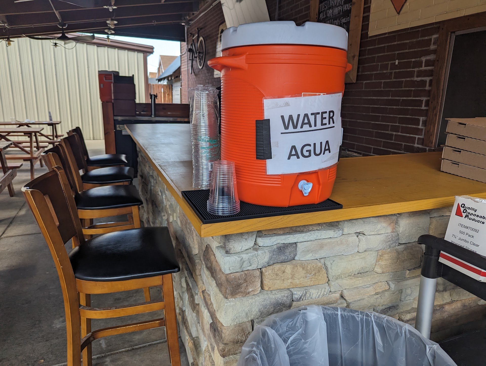 *The situation for ordering and receiving water outdoors is not explained by the staff, any signage, or on the menu (at least nothing I could find). There was a large pitcher (like one would see on the sidelines of a football game) labeled "water" and some disposable cups on part of the unused bar. I eventually grabbed my own fresh cup from the stack and poured my own water...I didn't get told /not/ to, and the water tasted fine, so I'm assuming this was the proper way. No staff ever offered to refill my water so I did it myself.