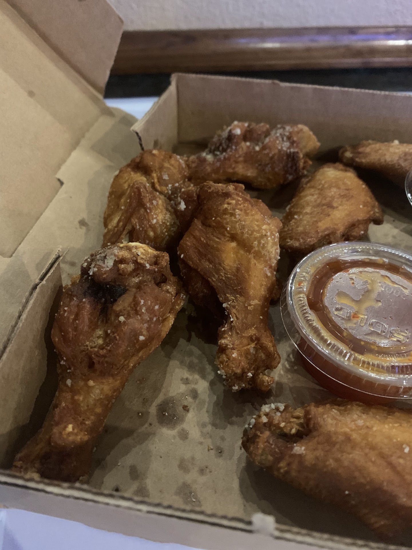 I came here for the pizza after getting a strong hankering from watching One Bite reviews. I googled “best pizza STL” and picked the first place I hadn’t yet tried. I ordered an 18” pizza with fresh basil, half pepper bacon. I saw in the pictures that they use actual strips of bacon and not just bacon bits like most places. I was sold. I figured I may as well roll the dice on an order of wings. Typically pizza joints have terrible wings but I’m always down to try them at least once. Boy was I in for a surprise.