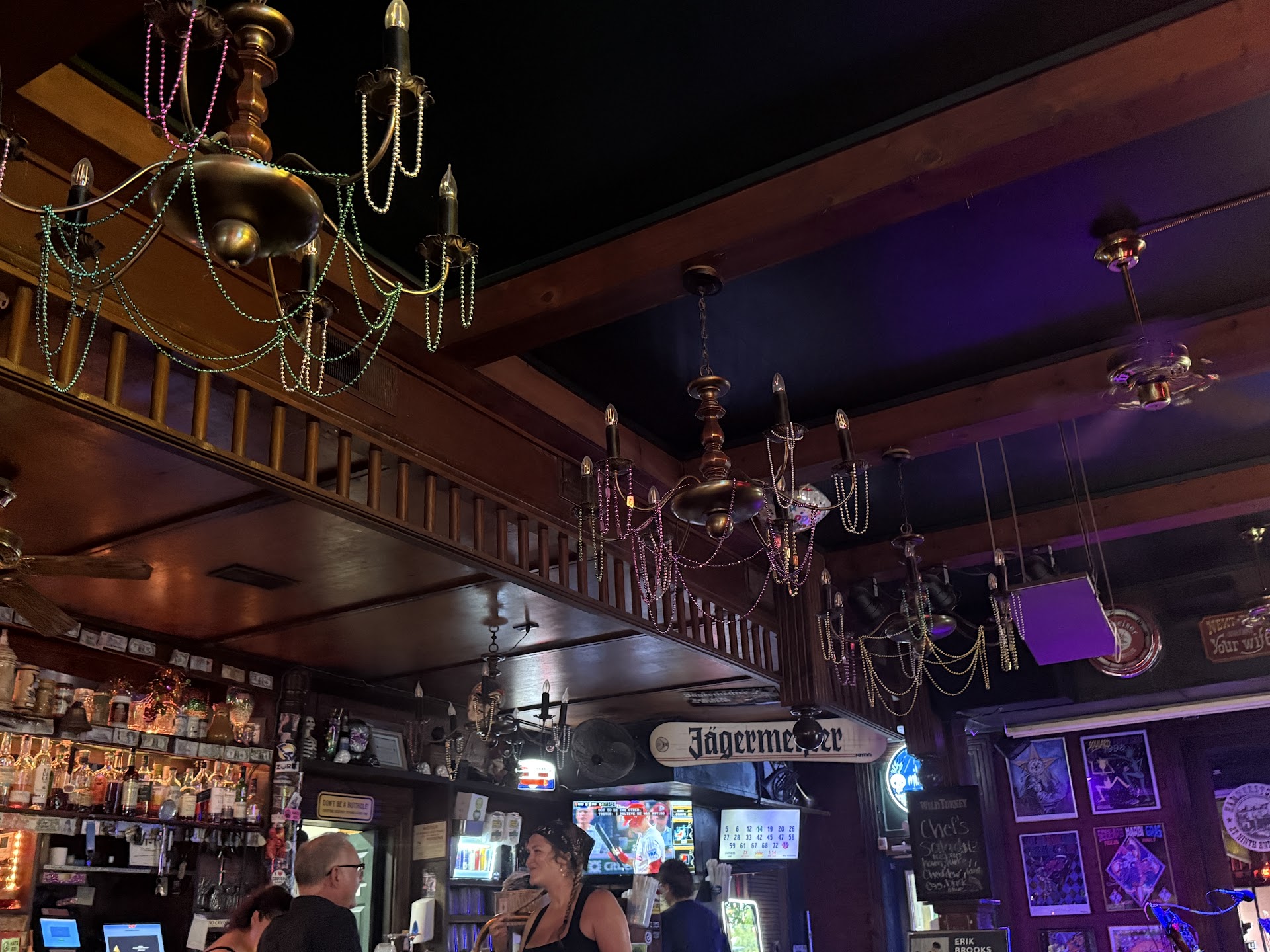 Atmosphere- fun, inviting, intimate and relaxed with dark wood furniture, a neighborhood feel and nods to Mardi Gras and St. Louis. There's a small stage with great live music every night. It can get really crowded on weekends and during events, but they also have a huge patio with a second bar outside, so it's fun. Breakfast is very popular here, especially on weekends.