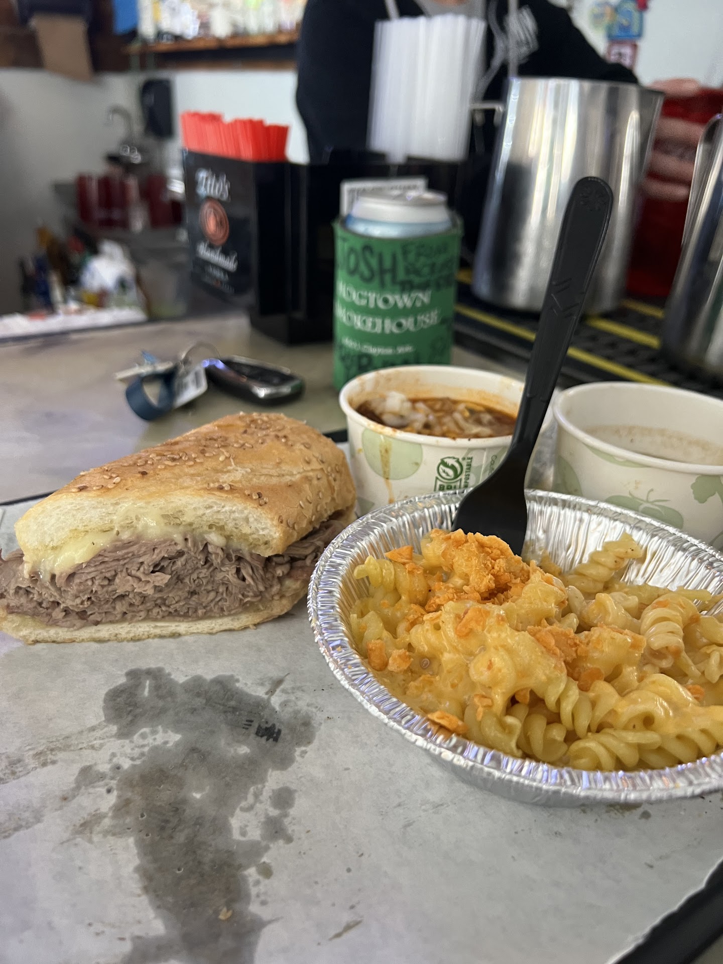 The menu is a testament to barbecue excellence, featuring a mouthwatering array of smoked pork, tender ribs, succulent brisket, flavorful turkey, and G&W sausage. Each dish is meticulously prepared, ensuring a delightful experience for both barbecue aficionados and newcomers alike. The French Dip, the crown jewel, is as best as they come. Accompanying sides like the creamy coleslaw and the uniquely delectable applesauce complement the main dishes beautifully, creating a harmonious blend of flavors. For those seeking a hearty meal, the Frito pie and mac & cheese are standout choices that promise to satisfy.