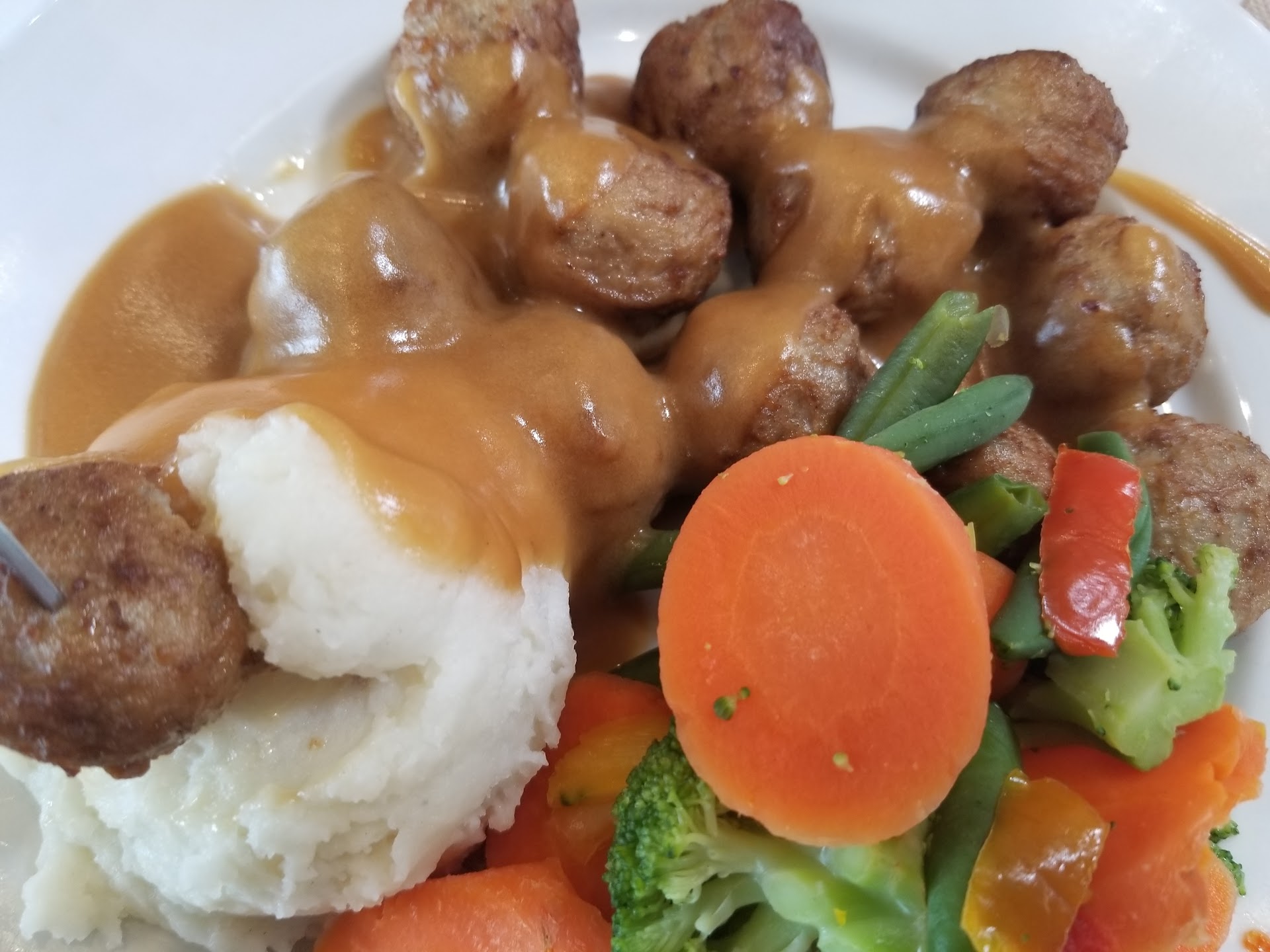 “Inedible, dangerous, and disgusting.” I’m half joking but that it what I said to my husband about it while eating there with our kids yesterday. My husband added “disappointing.” “Inedible” because I got a scoop of undercooked, unseasoned broccoli butts (no flowers at all!) “Dangerous” because my cup had a long, gaping crack down the side. “Disgusting” because our table was smeared with dry sauce and there was just crud everywhere (I do want to say that the cleaners were being active and seemed to be working hard). The meatballs and potatoes were fine but there was no gravy. Half of the drinks were out of order. The table was super wobbly (in a furniture store haha). I’ve eaten there several times. Even when they first opened. And it just always seems grimy/dirty, they are always out of something, and the line always takes way longer than expected. It’s just...