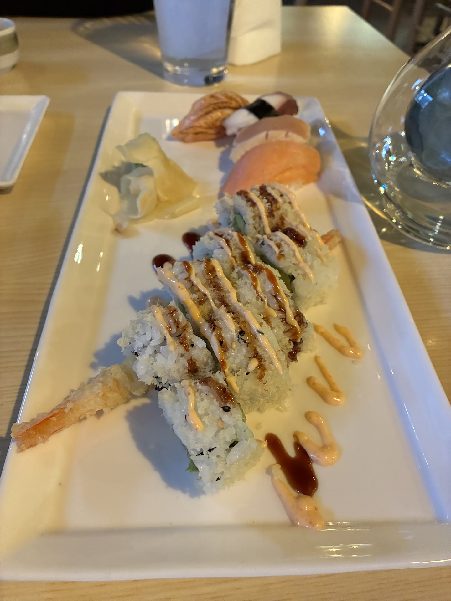 Read moreI've visited Kampai 2x before my recent visit with great experiences. During this occasion the restaurant was uncomfortably cold. Understandably, it's the winter time and many restaurant blow cold air for a "fast customer turnover". However, in the cold season I would imagine most restaurants would attempt to create a comfortable and cozy dining atmosphere. Most of the patrons left their coats on while dining, and the restroom was far colder. Aside from the atmosphere, I have loved their rolls in the past and am always open to trying a variety of sushi and sashimi at various restaurants. We ordered the squid as an appetizer, which was flavorful, but unbearably chewy. Our dinner choice was the Kampai Combo (BEWARE it is Chefs Choice as if there are some surprising elements to it) hoping that we would be able to try a unique specialty roll from the Chef (as the waitress suggested that we inform of any allergies) only to be highly disappointed by a typical California Roll -_- The salmon, tuna, and yellow tail sashimi were perfect, no complaint. The nigiri shrimp and salmon were excellent. However, the nigiri tuna was so overly spiced that neither of us wanted to finish it after the first bite. I would normally recommend Kampai to our friends. This time we were quite disappointed with our sub-par/subzero experience and may give it another chance in the spring when it's warmer. We most likely not be return...