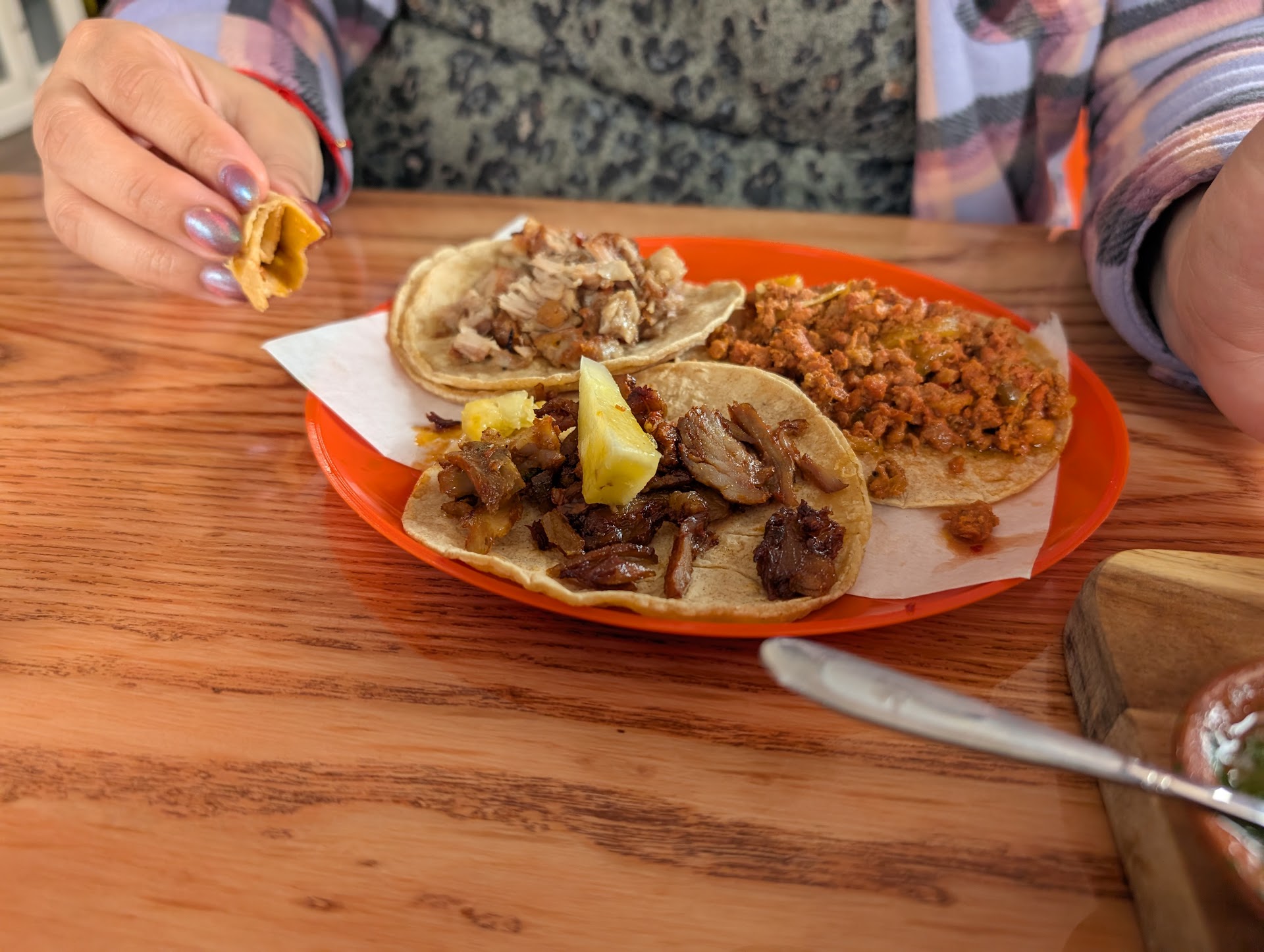 You order your tacos when you come in, before you're seated. I believe we tried them all, as well as the chicharones with guac (excellent choice for keto) which came out first with our drinks and water served in a patron bottle with fresh mint.