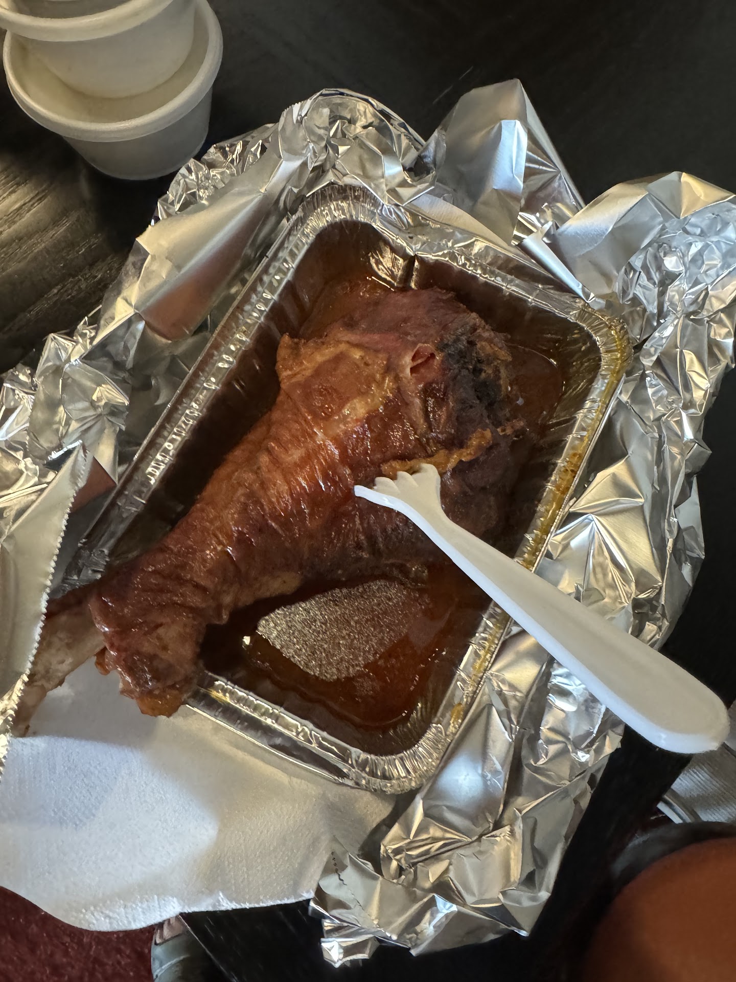 The brisket was setting when I came, so I questioned the Turkey Leg’s tenderness. “If I order a turkey leg, will I be able to walk around with the bone in my hand, or will I need a fork?” He proudly responded, “You can’t hold this up, you’re gonna need a fork!”