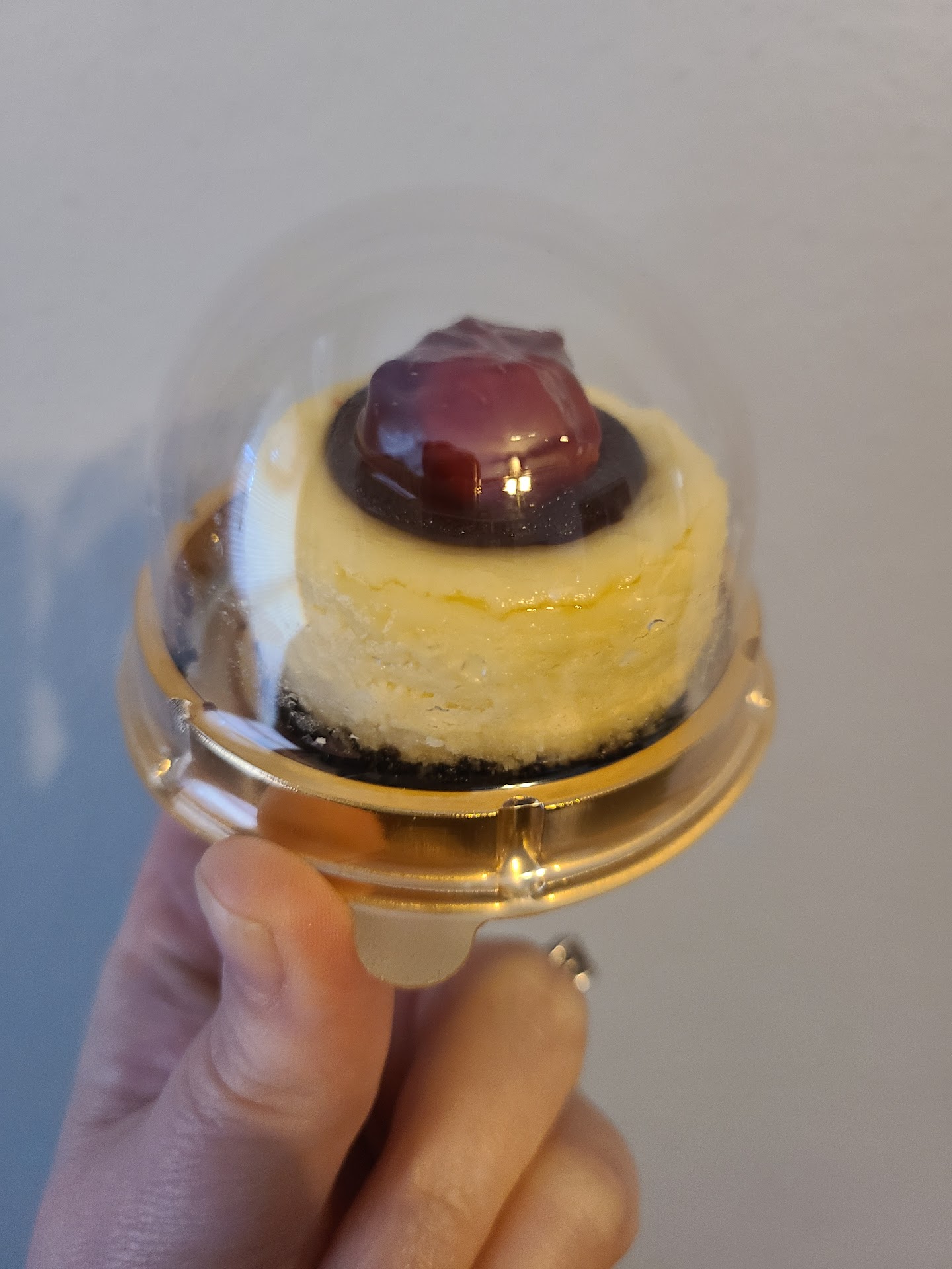 Read moreI got the mini chocolate cherry cheesecake and it was divine. It was the perfect size after lunch. But it was so delicious I wish I'd gotten a full slice :) the packaging it came in is adorable! Awesome presentation. It had a chocolate crust and plain cheesecake topped with a cherry. The cherry is resting on hard melted chocolate (like a giant chocolate chip) which was a great surprise.