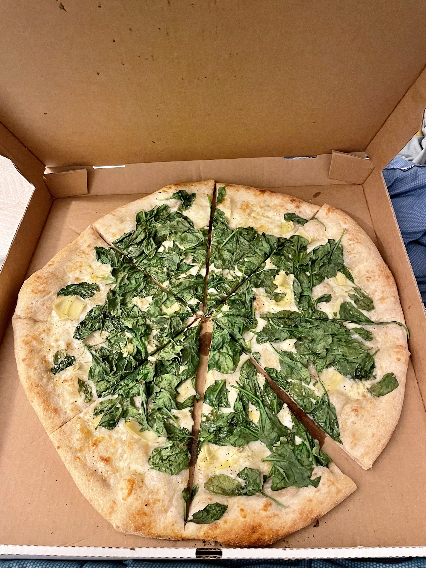 On the downside, it's vegetarian (eye roll) artificial punk aesthetic (super eye roll) and they stopped having slices ready even before COVID happened (maximum eye roll).
