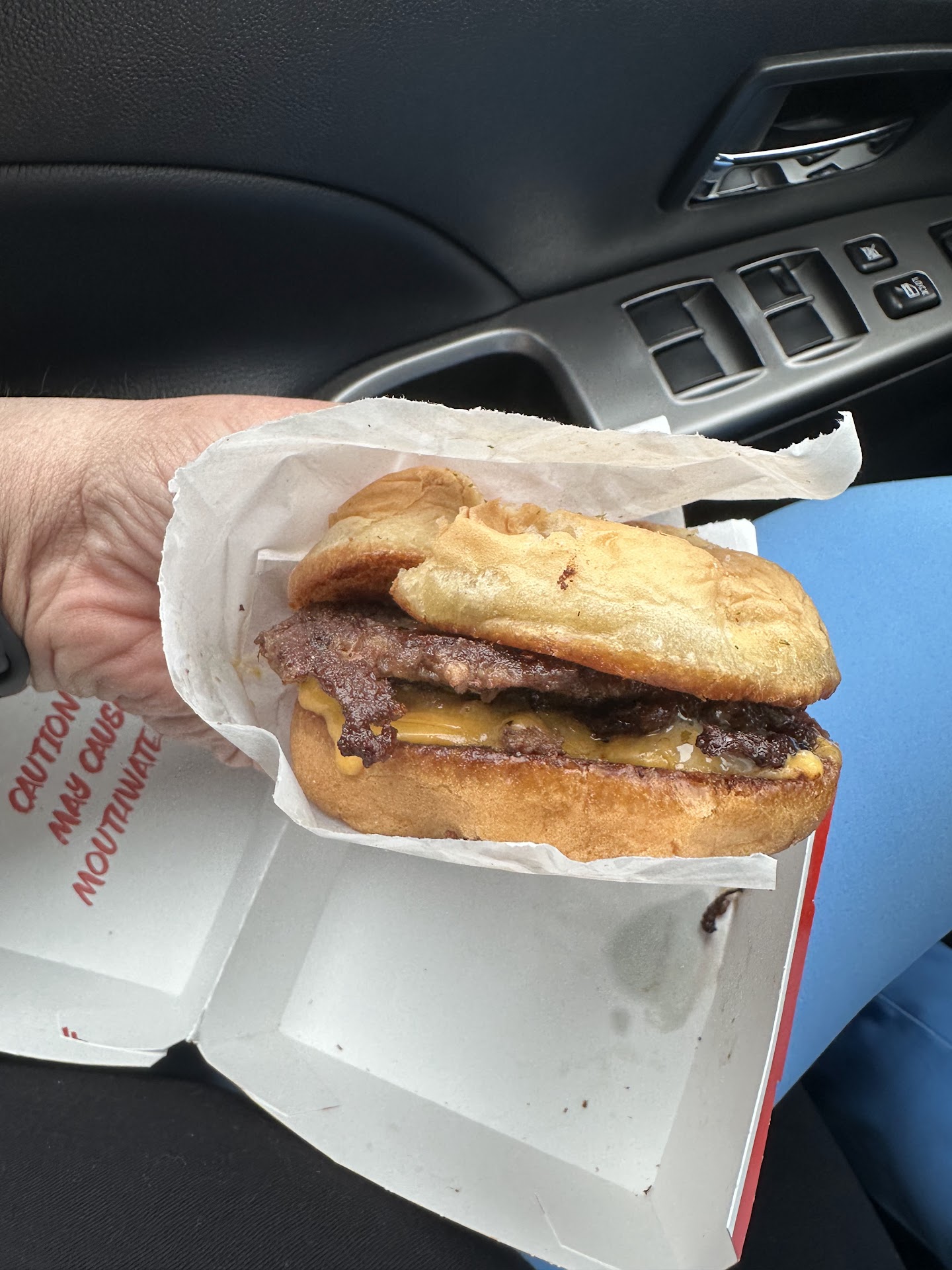 We pulled up to the Drive Through, and what a sight to behold: there was no line! That's right, not a single car was a head of us at 2 in the afternoon on a Saturday, something I certainly would never expect from the nearby location on Hampton. Upon ordering were were given the unfortunate news that the greatest deal Steak 'n Shake has ever offered, a double cheeseburger and small shake for $4, was no longer available :( . Nevertheless, Steak 'n Shake still has a plethora of deals, and we each ordered a burger meal from the 4 for $4 menu. The ordering process was swift and simple, with staff very attentive to our needs, asking us to clarify which toppings we desired on our burgers. Of course I love a full LTOP on all of my burgers, my roommate was sure to order his without any pickles, adding barbecue sauce to his burger. I am always hesitant to partake in any fast food barbeque sauce; I have always been blessed living in one of America's great barbeque cities, never having any desire for what I can only assume would be horrendously disappointing sauce, though my roommate seemed to enjoy it. We pulled through to the window, again with no cars in front of us, and within only a few minutes a friendly young man served us our food.