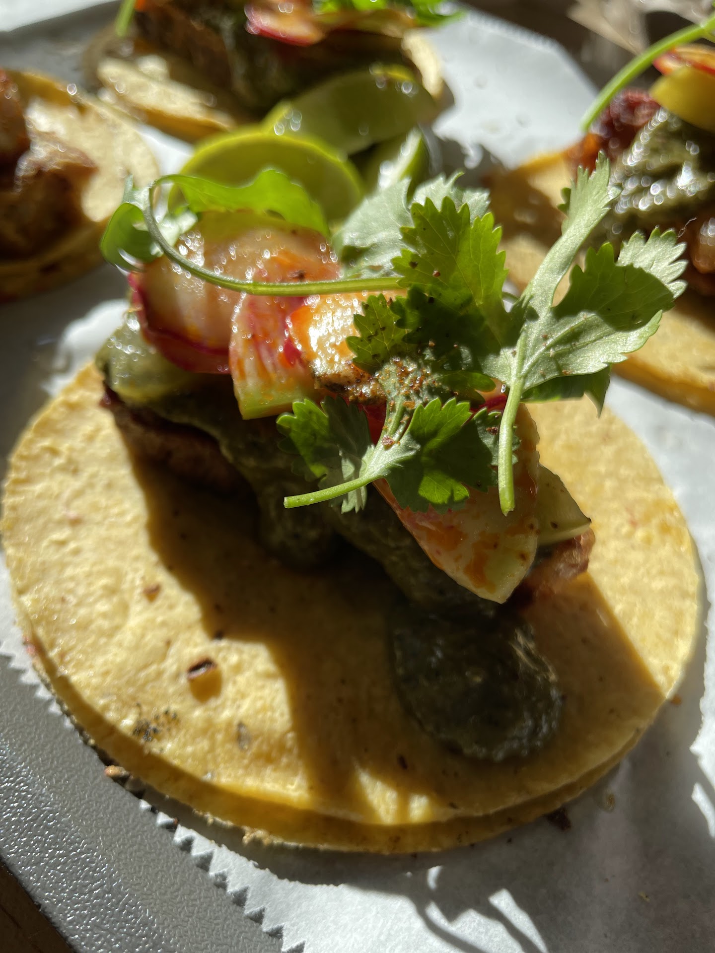 We tried the pork tacos which werenāt bad but could have been done better. The come 2 to and order. The pork belly skin was not properly rendered and ate so sticky it stuck to my teeth. The tacos were generously filled but made it almost impossible to eat all components together. The sauces were bright and acidic which helped cut the fat off the protein.
