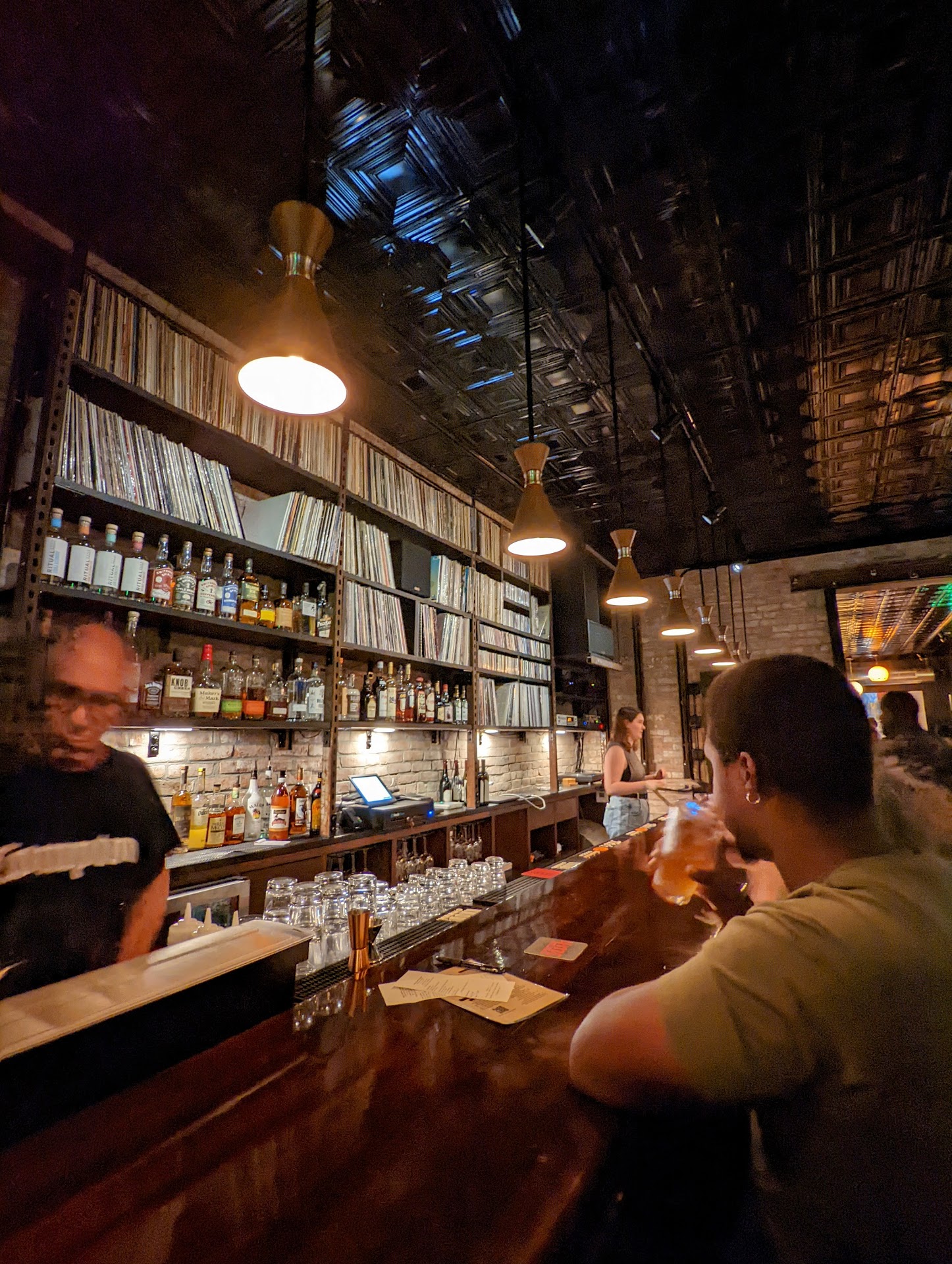 The vibe inside is excellent. Some love and thought has gone into this renovation. Lots of cozy spaces with a good sized bar backed by a wall of LPs. We felt immediately comfortable when we walked in. It's similar to that record bar on Manchester in the Grove. They also have a good sized patio out front. You go to the bar for service. Staff seemed friendly.