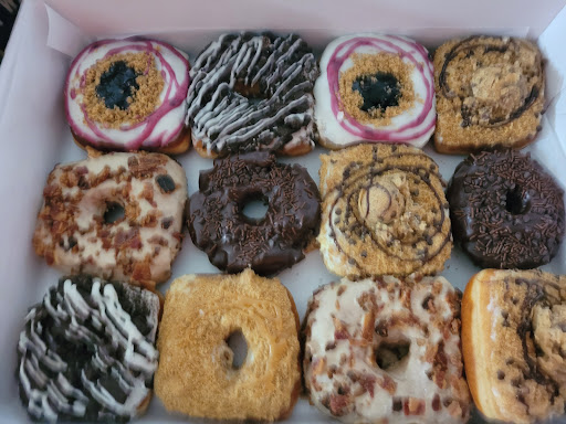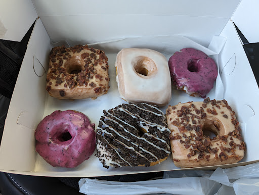 Might not be for me.... *Before I share, I will preface this by stating that the clerk I interacted with did mention that they looked very large today so I'm curious if maybe something went wrong with this batch. Maybe because I was super excited to try these or the hipster look and locale or the appearance of the donuts.... but I was super let down. Tried an assortment from blueberry cheesecake to chocolate chip cookie dough to cookies'n'cream to maple bacon (the one I was really looking forward to). Overall, the donut itself was very thick and heavy in texture and tasted more like sandwich bread than a donut. The donut was very bland and almost seems intended to rely on the heap of toppings. (The wife and I cut donuts in to quarters so we could sample all the flavors we got. Washed with a lemon drink in between for fresh flavor each time) Some notables: The Chocolate Covered Chocolate Cake: described to me as a chocolate old fashioned style donut (old fashioned sour cream is one of my favorites). I'm not really sure what it was that I ate but I didn't feel like it was a chocolate cake. The donut was thick and bland with a hint at wanting to be chocolate. The toppings were kind of an overload of chocolate that my chocolate loving wife struggled to even really identify how it tasted. Just tasted off. The chocolate chip cookie crumble and the cheesecake cookie crumble: these both had a brown sugar crunchy topping (I think) that is the only topping that actually compliments the thick and bread donut. It provides some sweet to compliment it with some texture to break up the thick feel in your mouth. These two I didn't really mind much and would consider having again. The Maple Bacon: 😭 I was super sad when I got into this one. Like most people, I love me some bacon. I'm a chubby dude and have tried bacon all different ways. Not my first go at a Maple Bacon donut....so I was excited because it's bacon and Maple topping.....perfect compliments. Hoping it would handle the donut texture (I save best for last)..... the Maple topping never really came through. I was left with an overpowering burnt bacon taste. The bacon was not visibly burnt anywhere so I'm curious if I got a late batch and the early batches had burned the grease and the flavor carried. The burn taste really took over the entire donut. I will repeat it is very possible I caught an off day as I have a friend who swears by their light and fluffy donuts but for now I won't be back. The price is a little steep for donuts but worth it if I had been satisfied. Prices will vary but I paid about $45 for a dozen donuts (the 12th was free with purchase of 11). The place looks amazing inside with a very hipster feel to it. The service was super friendly...