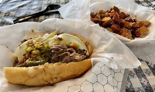 The store is nestled in a suburban environment, and is a converted old school hairdressing place. The front nook area next to the window is where the hairdryers used to be located. At my arrival, after getting lost along the way while walking (wrong turn), there was only a customer waiting for her take-out. The environment is very casual with 70s-80s rock music blasting out of the sound system. I settled down and ordered the combo of Italian beef and sausage. Saw the Vinnie’s fries on the menu board, and ordered that to add another texture alternative.The meal arrived shortly, and it was a huge sandwich. Vinnie uses his own blend of Giardenera as one of the toppings. Being accustomed to the traditional Italian beef/sausage sandwiches, it was not the usual fare I was used to from Chicago. While the combo sandwich was good. It was very different. Overall, I found the beef less tender than the norm, and the sausage lacked flavor. The green pepper slices in there needed to be more tender (My preference). I feel strongly that the meats (both beef and sausage) need more salt during the preparation. The ingredient that intrigued me most was the house Giardinera. It tends toward the sweeter side, and adds a refreshing crunch and freshness (The norm is pickled and tasted so.) to the sandwich. Overall, the sandwich was good, but it is not quite there yet. The Vinnie fries, however, are most unique, and must be ordered when you are there. There is so much character to that side that I have not found in any other place to date. Overall, the combo with the Vinnie’s fries rate a solid 4.5/5 stars.
