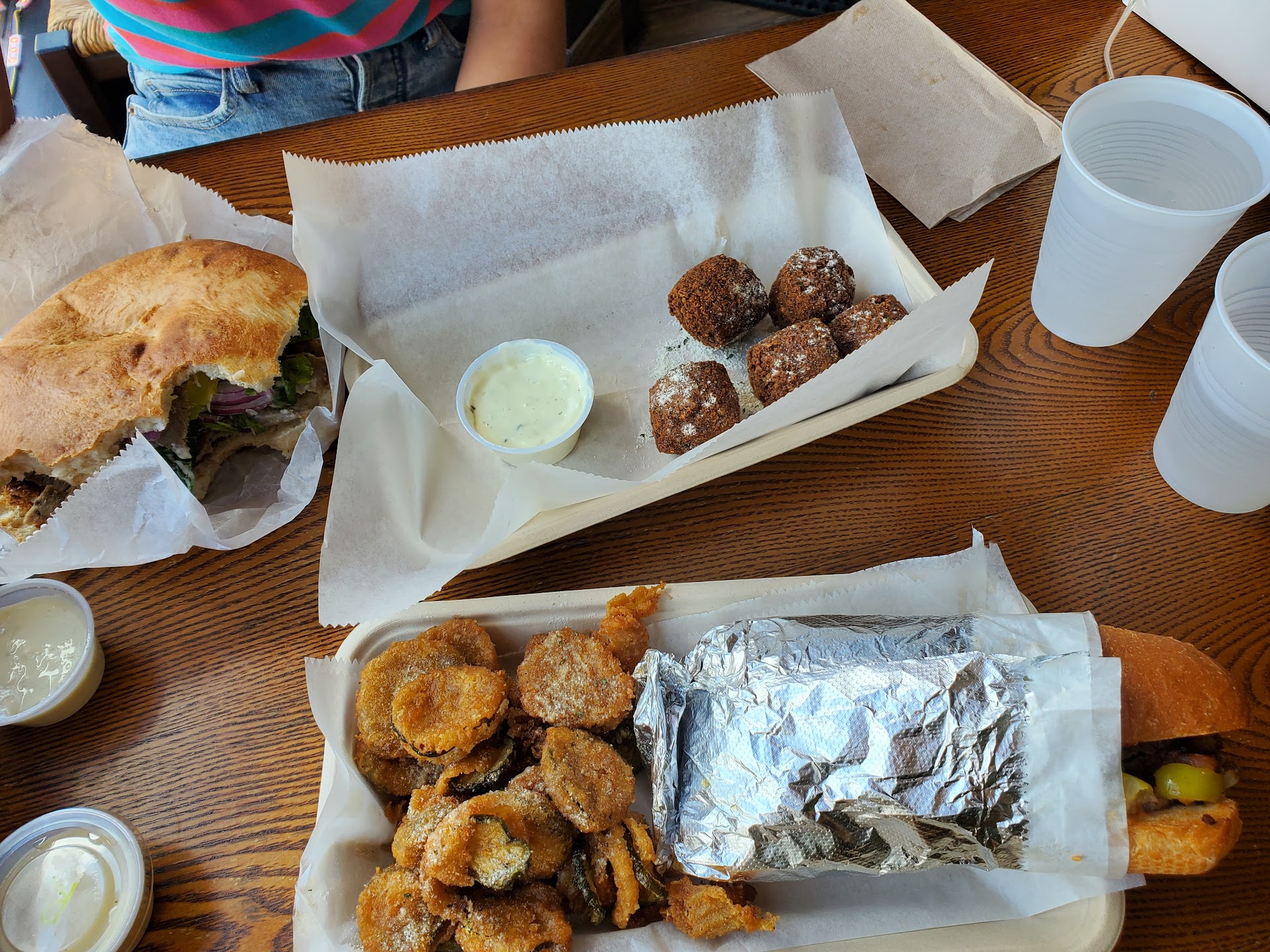The space was well-decorated and clean. I ordered the Philly Sub with a side of fried pickles. Italian subs are my very favorite sandwich, but this really changed the game. It tasted similarly to an Italian sub, but had melted cheese and sauteed cucumbers. It was rich, savory (exactly what I was looking for), and quite filling. I can't wait to return and order another. The fried pickles were also delicious and reheated well in the air fryer at home. My sister ordered the gyro supreme. It was double or triple what she could eat (as she was warned, haha), but she was happy to have leftovers. She also ordered falafel. We took home more than half of what we ordered and only spent $34 between the both of us. I was very pleased with their prices, I feel like I haven't seen anything priced that low in the city in years- and for such a...