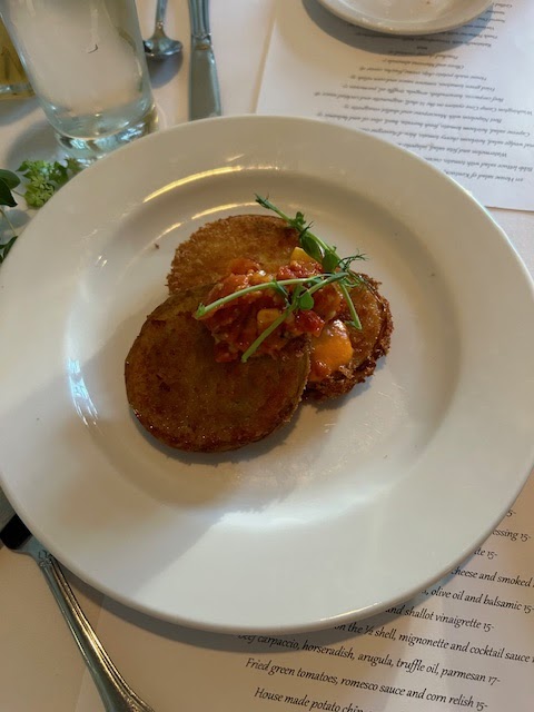 For an appetizer we ordered the Beef Carpaccio. It was bland and creamy. The cream did nothing to add to the dish. It was supposed to be a horseradish cream...not a sliver of horseradish was in there. Not a drop of salt. I ordered the grilled Caesar salad and it was adequate. The Caesar dressing was pretty good and I liked the char from the grilled romaine but I think they overdid it because part of the lettuce had more of a texture like steamed spinach, which wasn't great.