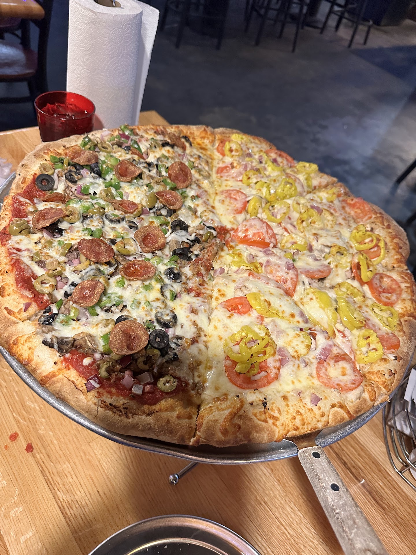 Service-wise, our waiter was excellent. They were knowledgeable about the menu and helped guide us through the different pizza options. The variety here is impressive, with something to satisfy just about any taste. One thing to note is that the pizzas and slices are massive, so definitely come with an appetite or plan to take some home.