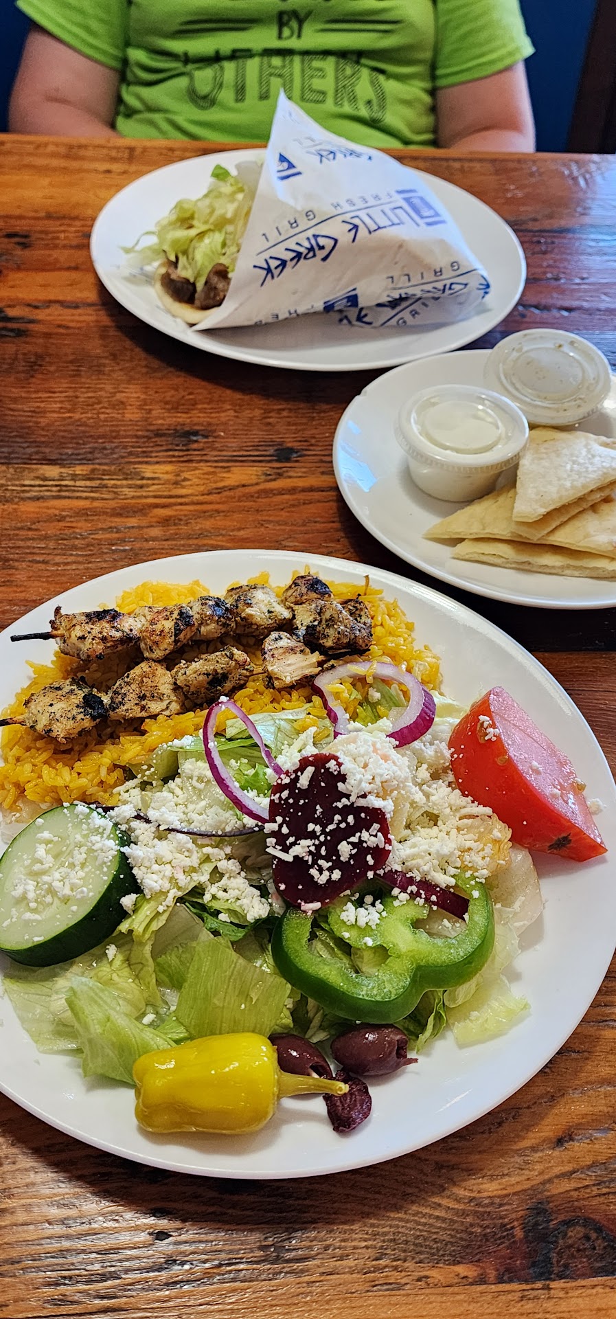 We ordered a Gyro Pita and Chicken Skewers (Souvlaki) from the Light Meal selections, which came with pita bread and a Greek salad.