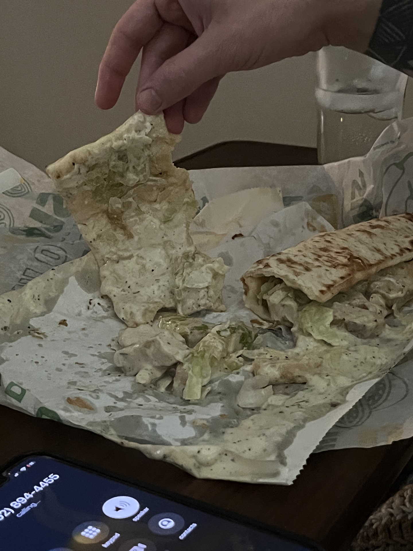One was a chicken, lettuce and double cheese sandwich. There is no cheese at all, even though we paid for extra. The flatbread is hard as a rock and obviously old and past expiration. They put an ungodly amount of ranch on it too, to the point that it is inedible.