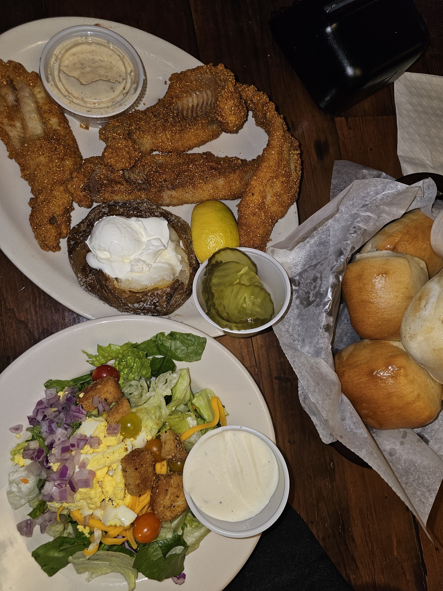 Then we walked to my table. My sever came, I placed my order with my ticket that tells her my steak of of choice. (#45 The last Bone'in Ribeye). To go and a catfish dinner to eat in. (And I verbalize it)