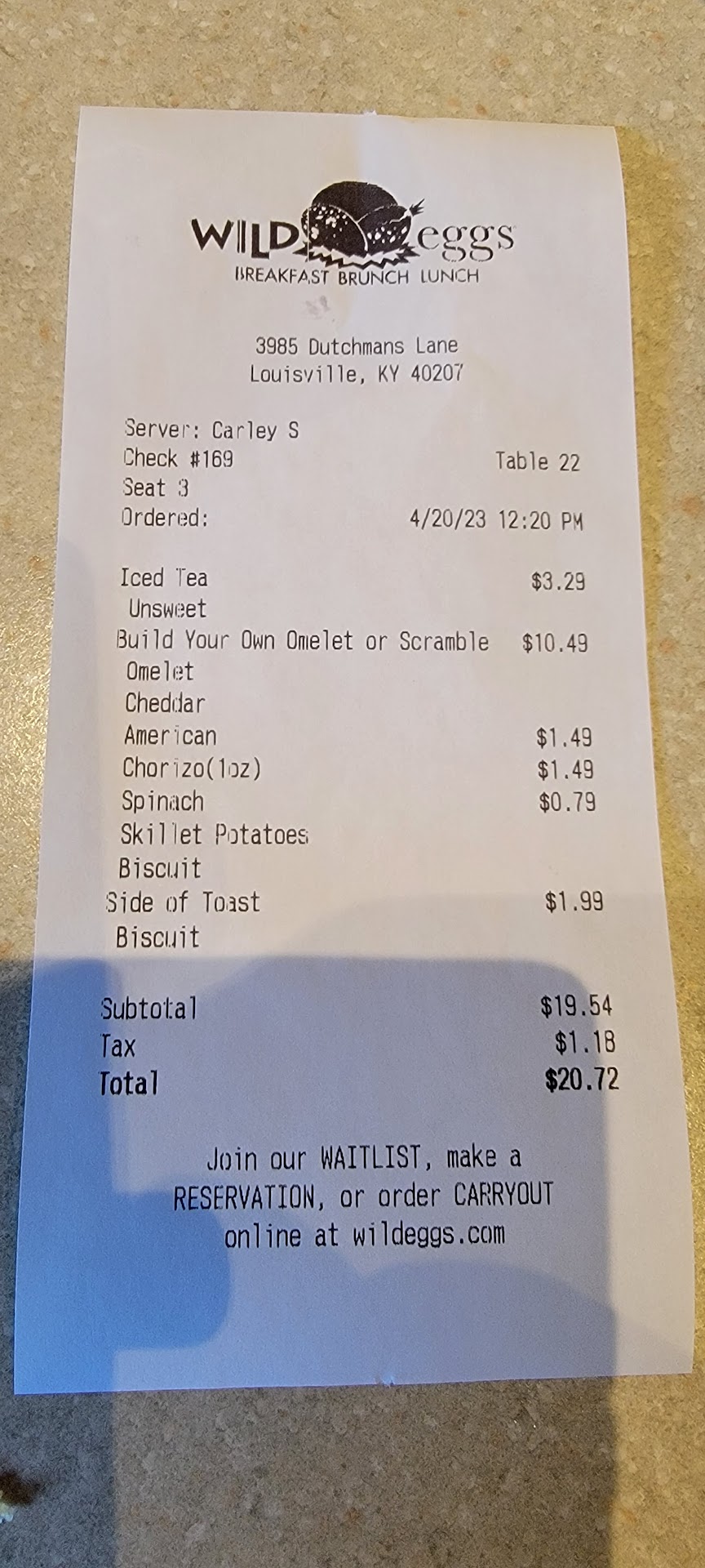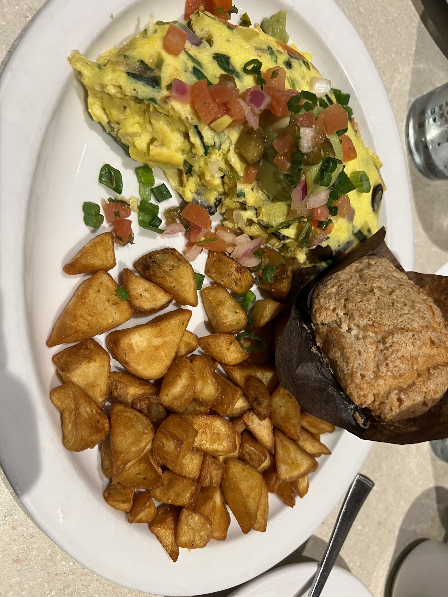 Went here on 4/20/23 and was amazed with the quality of the food. I took pictures of what I ordered and got a "build your own omelete" with chorizo, spinach, cheddar & American cheese, and 2 buttermilk biscuits.