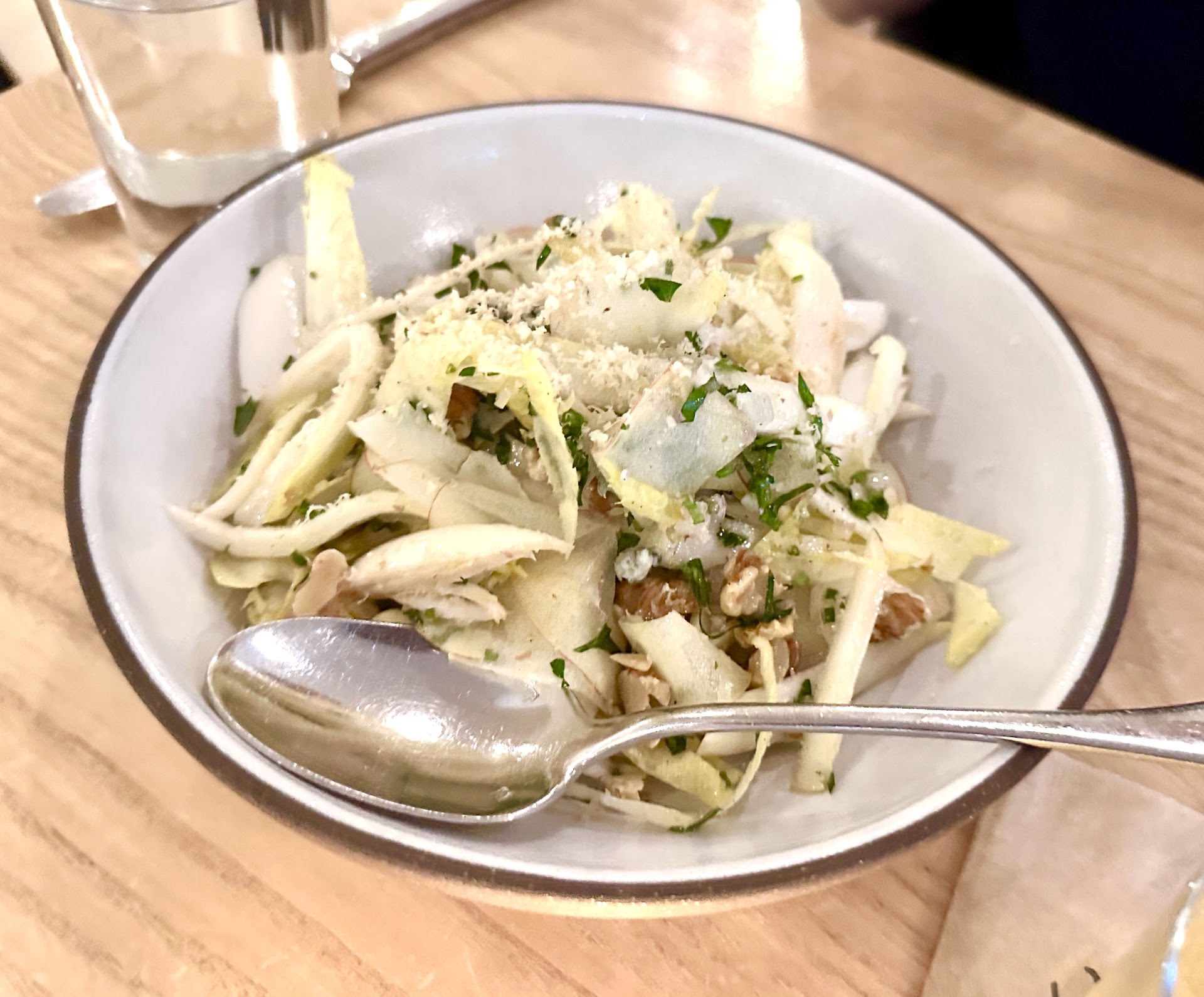 The chicory salad should be removed from the menu. $14 for dressed greens in ridiculous but the greens are way too bitter for nothing else to be on that plate. Offset the bitter with an easy green and some nuts and fruit. My husband couldn’t eat his portion citing that is tasted like stomach bile. I didn’t have that strong a reaction but I would never order this again. I honestly should have sent it back.