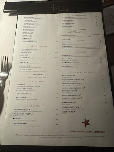As a frequent guest of this establishment we have finally had enough. The food is always above average and not fantastic. The other night the floor was woefully understaffed. The waiter would ādisappearā for 15 minutes at a time. Drink order, wait 15 minutes. Food order, wait 15 minutes. So sad. Buyer beware though; Theoās charges $6.00 to change a side from āmashed potatoesā to say āsweet potatoesā. Any deviation from the menu (even if it a cheaper side - they charge). Donāt get us wrong, we fully understand a substitution charge if the overpriced menu was fairly priced. Also, my favorite experience (2nd time they did this) the waiter offered āFrench friesā but failed to qualify that they cost $11.00. By the way, itās not worth $11.00.