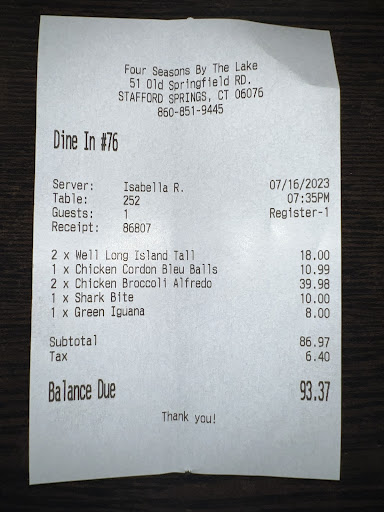 Next, the dinner. We ordered the Chicken Broccoli Alfredo entrees. They came with a salad which came out with browned lettuce. The entrees themselves were definitely not worth the $20 price tag for each. It was a large portion of pasta, barely any chicken and broccoli in it at all. The cheese was more like a Mac & Cheese than an Alfredo sauce. The dish was still good, but not what was expected and absolutely not worth the price. I would recommend if you are looking for this same dish there is another local restaurant Basil’s in Stafford that makes it fantastic and definitely worth the price.