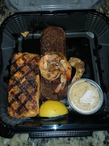 FOOD AND DRINK Old fashioned: 2/5 Ribeye steak and grilled shrimp: 3/5 Alice Springs Chicken: 3/5 Coconut shrimp: 3/5 Mashed potatoes: 3.5/5 Blue cheese pecan chopped salad: 4.5/5 Baked potato: 4/5 Chocolate thunder from down under: 2/5