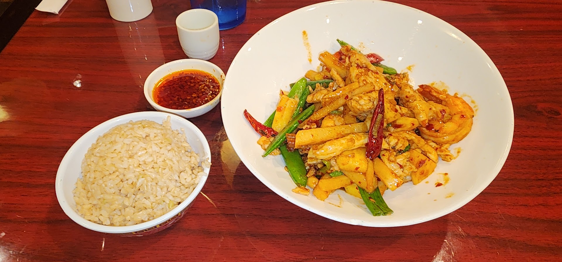 Read moreI've been here a couple of times, and I'd say it's one of the better Asian food places close to me. So this past Friday I ventured back. There's plenty of parking and me going about 6:30 PM there were plenty of open tables. Started out with a Thai soup (sorry, don't remember the exact name, but it was really good.) I've always loved the cold sesame noodles here, and had those with extra sauce. The flavor was superb, but the thick noodles were a bit gummy. Nevertheless, I can't complain much as I finished the entire bowl. My entree was a Kung Poa chicken/shrimp combo with brown rice and it was fantastic! I ordered many bowls of hot chili oil to use with all my dishes. Love it spicey!!