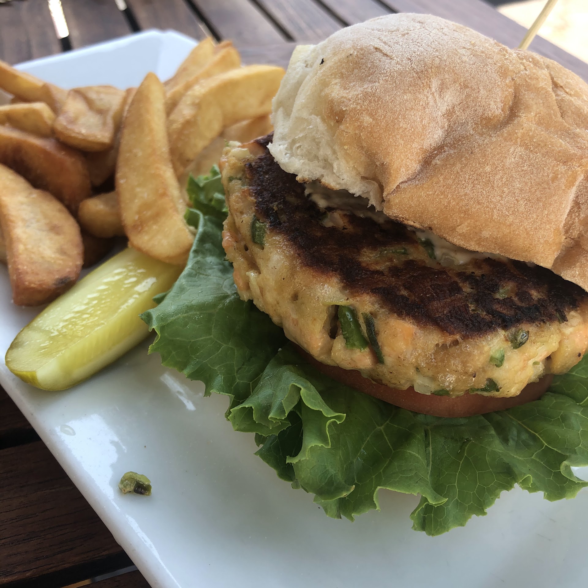 Food: Salmon burger and steak fries were great quality. A tiny bit pricy at over $18 for just that lunch entree, but the burger had lots of salmon chunks, so the quality...
