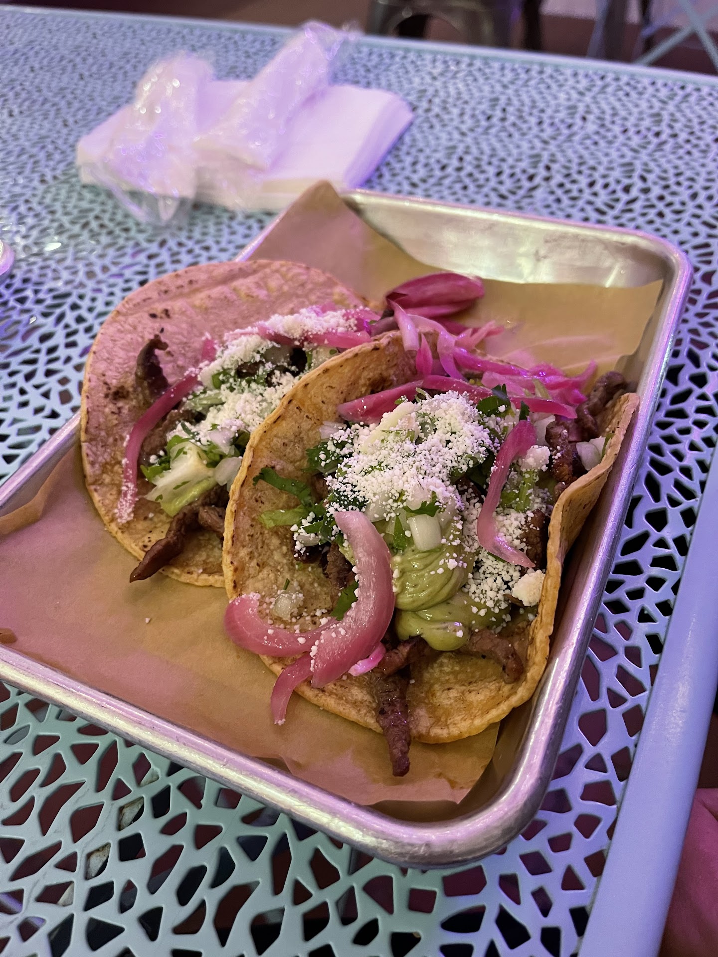 In fairness, I'd probably give Chicho's a 3.5 if I could. The restaurant is small, but super cute. I loved the interior sign - "all you need is love & tacos." The staff was friendly and helpful. So on to the food - I ordered Shrimp Tacos. Overall the tacos were good, but could be great. I thought the Mexican corn on the tacos was a really nice and cool addition. The chipotle slaw was ok, but could have had more chipotle kick, and honestly between the creamy corn and a creamy slaw, it was way too creamy. The diced onions on top were a little too big for my liking. I was disappointed by the shrimp as they seemed to be pre-made (frozen) popcorn shrimp. I was also disappointed that they only used one tortilla per taco. With corn tortillas, I am accustomed to have double tortillas, especially as full as the tacos were. It became a little challenging to eat the tacos. I am not sure if I would go out of my way to visit Chicho's again, but glad I tried them. Other notes: I had no issue parking, but it is...