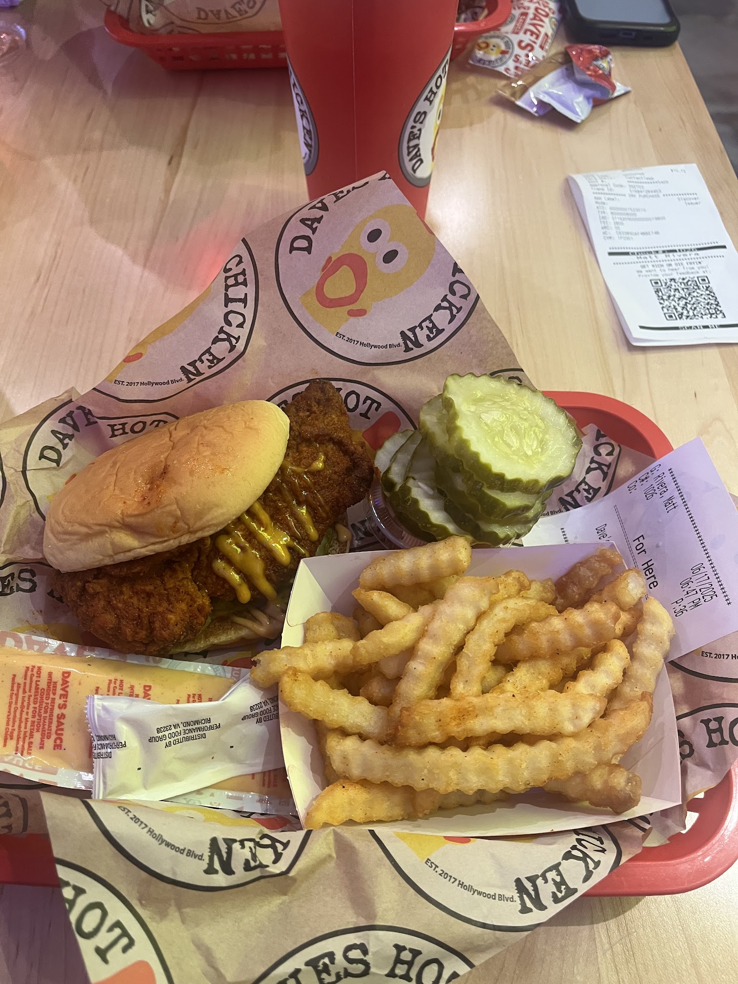 Read moreThe atmosphere inside felt perfect for their brand. I liked the graffiti art on the walls as I felt it gave Dave’s a unique detail that most fast food chains don’t have. The music went well with the type of environment they foster. Despite mainly serving chicken, Dave’s Hot Chicken offers a plethora of options to choose from. I did find the customer service to feel rushed and unenthusiastic, but the food was nonetheless great. The chicken and fries were crispy, but the bun on my slider lacked flavor and did not compliment the sandwich as I imagined it would. Overall, I enjoyed my experience at Dave’s Hot Chicken because the texture and flavor of the chicken were amazing. Their sauces also pair well with their sandwiches and tenders. Today, I used their signature sauce and some honey on my sandwich to add even...