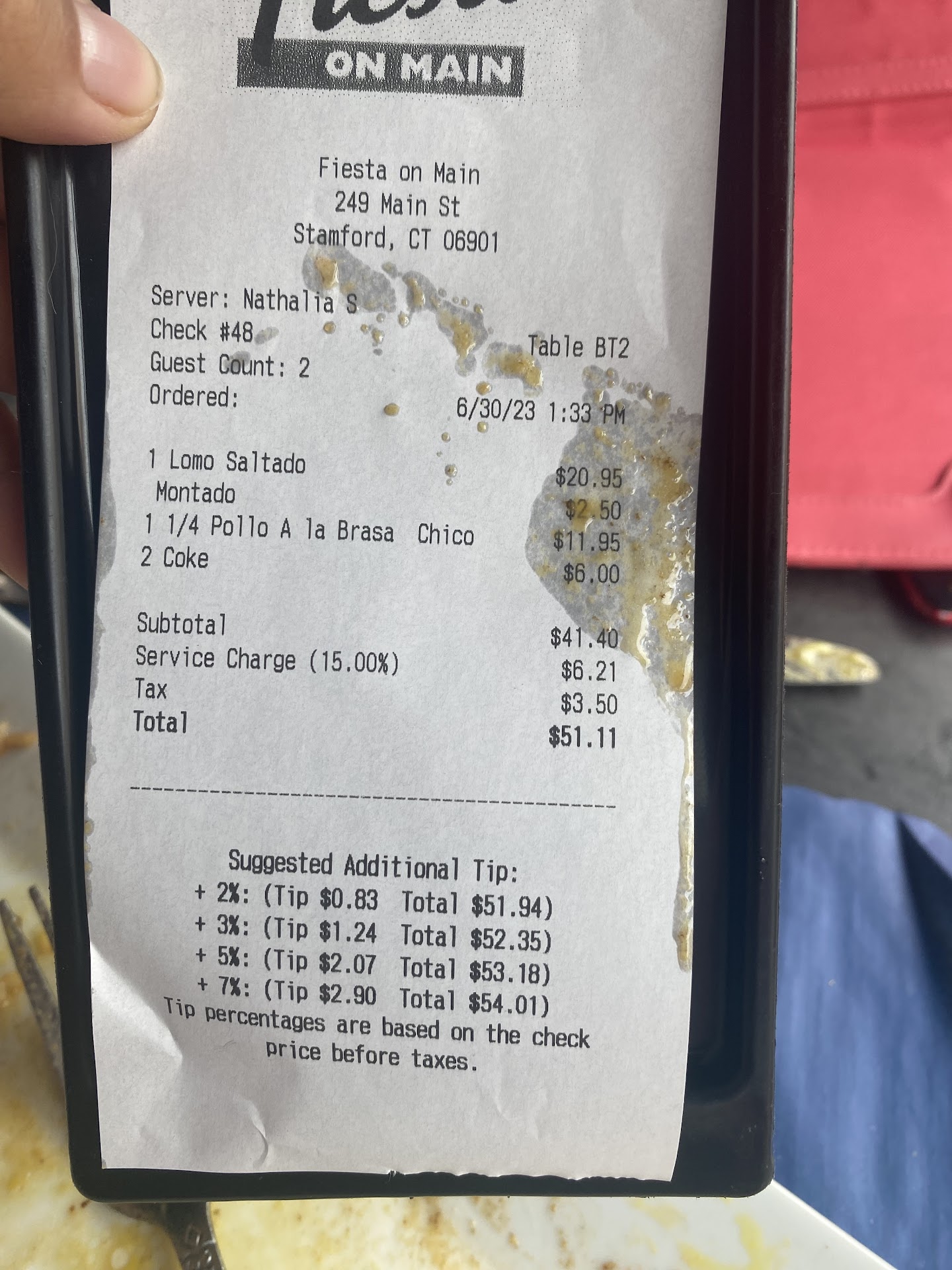 Read moreWhenever I try a Peruvian spot for the first time, I always go with the classic: Lomo Saltado. Fiesta’s version didn’t disappoint. The dish came out fresh… the fries and tomatoes still had a crisp bite, which is rare. The steak was tender with barely any tough or fatty pieces, and the rice soaked up just the right amount of that savory lomo juice. Flavor-wise, it was spot-on: not over-seasoned, which let the natural tastes of the steak, onions, and fries shine through. Easily one of the best lomo saltados I’ve had. 9/10