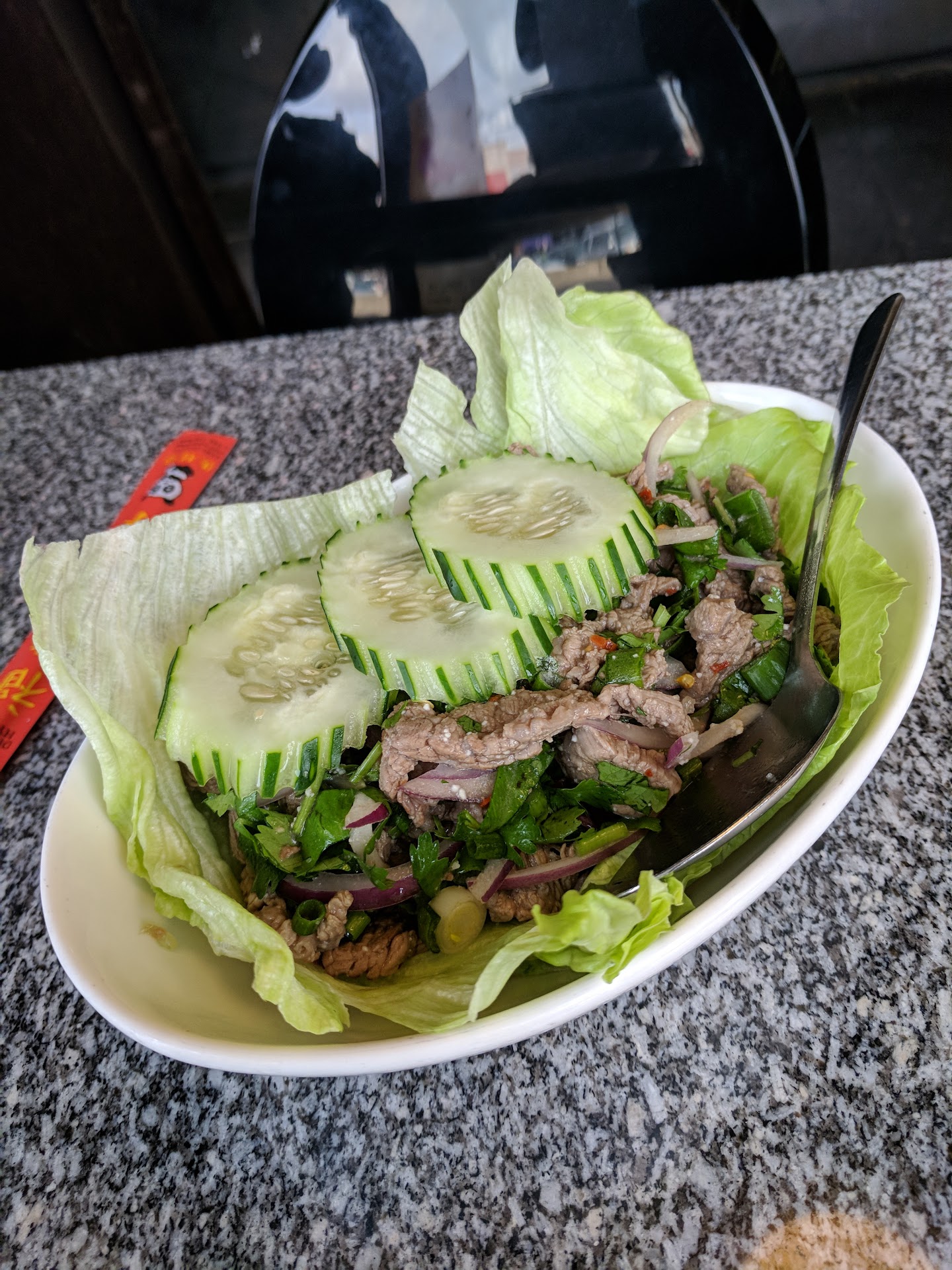 Read moreA little awkward at first. The service window was right by the door so instinctually you head towards it but there's a few signs saying to wait for seating. Menus are already laid out at the table so you can have a look right away. Everytime I visit a Thai restaurant I always go for the Tom yum soup (hot and sour) and/or Nua Nam Tok (spicy beef salad) and this visit was no exception. Food came out at a good pace and it was delicious. The serving of beef was on the heartier side which can be overwhelming if you are expecting a salad but it was good. The steak could have been cooked a little less or at least gone through a different cooking method to make it less chewy. Other than that it was just the right level of spice (though you can crank it up two more levels). The soup was fantastic and I loved that they give you the option of just vegetables or you can have shimp (which is traditional) or chicken. I wasn't feeling shrimp today so I went light and got veg. Overall...