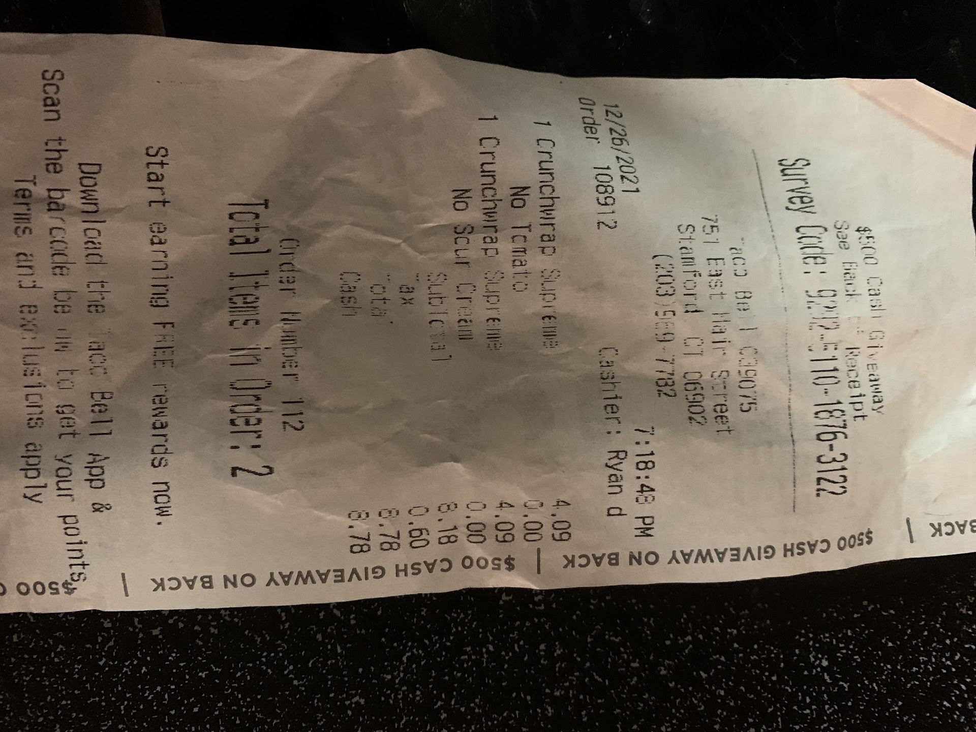Read moreIf I could give this place no stars, I would. My family and I had a 4 hour drive to connecticut and we arrived around 8:30, we decided to stop at the taco bell near our hotel to get a quick bite to eat. We figured since it was NOT busy at all, we could run in and run out. But unfortunately that was not the case. When we initially walked in, nobody greeted us. A rude woman yells from way in the back that she'll be with us in a minute while there we 2 other young employees standing right in the front. When she came to take our order she was very rude and it felt like we were being rushed. When we received our food, we were given hard tacos instead of soft with our meals which we paid and extra 10 cents for each soft taco. And our cinnamon twists were forgotten. when we had finally gotten the women's attention to tell her about the mix up, she became very agitated and rude and said that we never asked for soft tacos. when we showed her the receipt that clearly charged extra for soft tacos she grabbed our food, threw it down, and sloppily made us new tacos and was rude when she gave them back. Again she still did not give us our cinnamon twists so we had to ask her again for those and again she was rude. I've never had an employee argue with me over something that was clearly printed on the receipt. Not that i'll be back in the area any time soon, but if i ever am, I will...