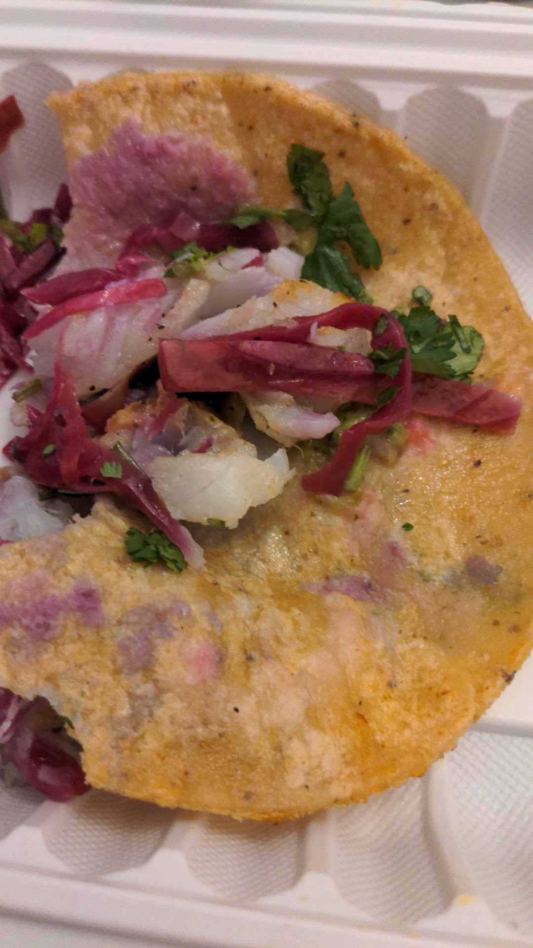 The chicken and salmon tacos were ok, had some richness from a zesty mayo. Shrimp had potential, I liked the toppings, but they were overcooked to the point of being rubbery. The fish was not good at all, I only ate a bite. Even more overcooked than shrimp, not flavorful, and ruined by the purple slaw. The slaw was too watery and soaked the tortilla and fish with cold purple juice, which aside from tasting bad also made the fish appear grey and unappetizing.