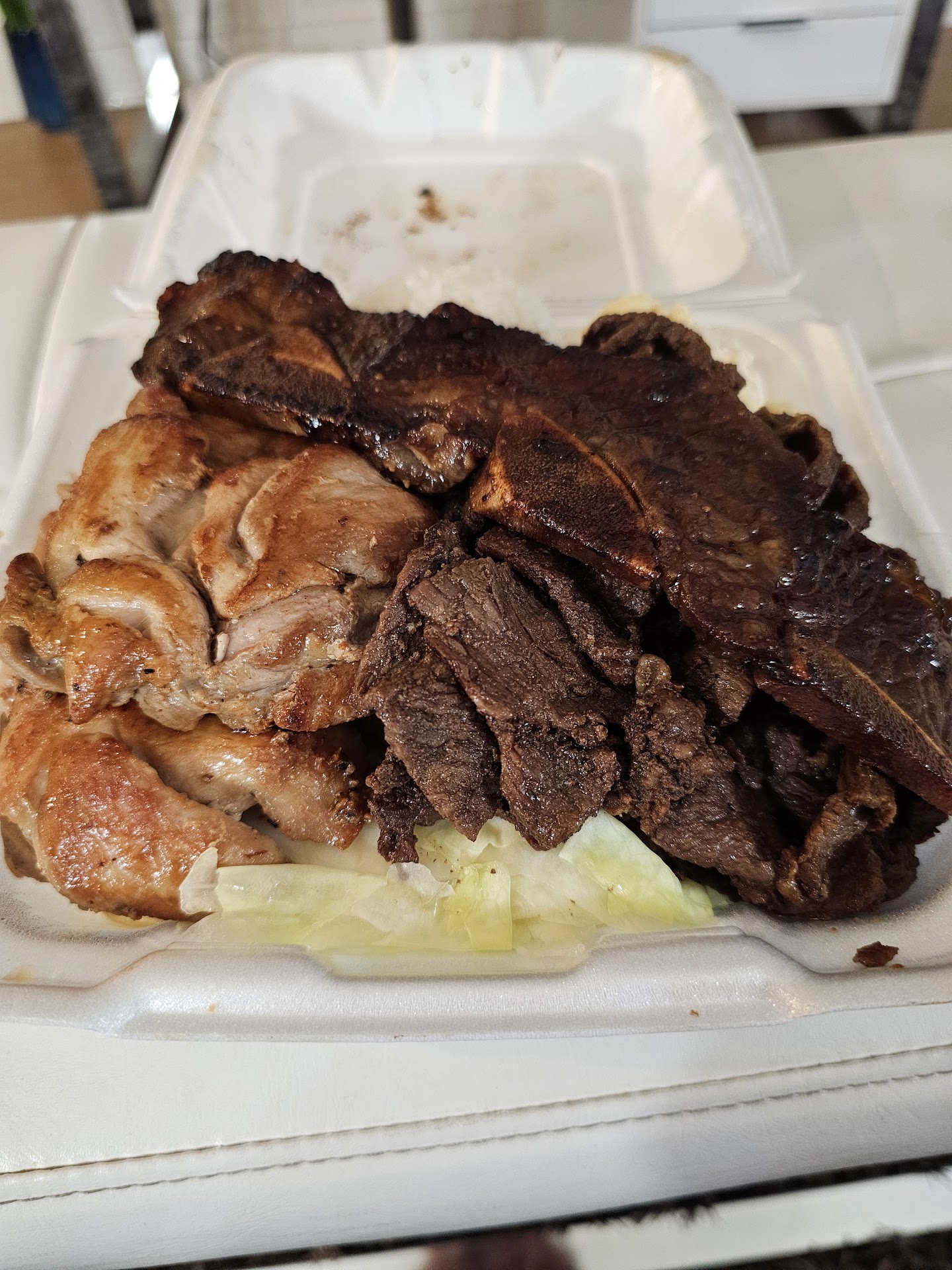 Read moreThis place is the worst "Hawaiian BBQ" I ever had in my life. It used to be okay and tolerable but now it is just downright disgusting and sad. My food was ready and packed in under 5 minutes which should be a big red flag. The BBQ combo I ordered showed two pieces of kalbi ribs in the menu photo, but there was only one piece in my order and not only was it a nearly meatless cut, it was burnt to the crisp and inedible. I am almost 100% certain this was cooked the day before then reheated by microwave (see photos). To compensate, they added a mountain of flavorless beef strips that were hard like jerky. The BBQ chicken was cold and not grilled at all - just rubbery slabs of meat with no marinade, flavor, or smokey char whatsoever. Teriyaki sauce was cold and couldn't save this sad excuse for food. Only saving grace was the macaroni salad. You know this food was terrible if I spent $20 and still threw it in the trash after a few bites. This place either needs to get it together or close its doors, what a disgrace of a restaurant...