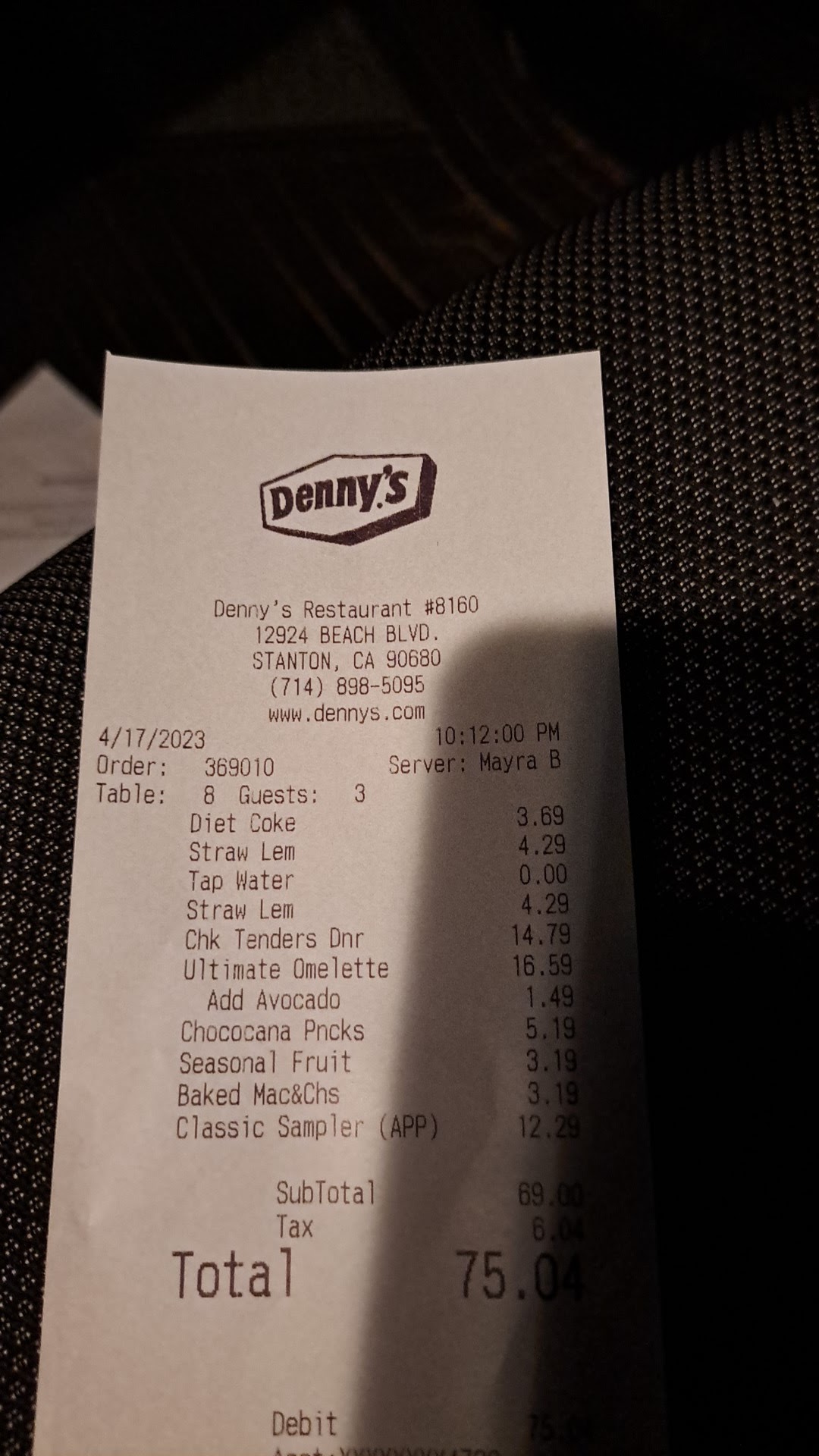 And all this happened on July 26th 2018 little after 6:15am my card was still charged in full. Lost money on calling cab approximately $15 because I had to go to fast-food restaurant to order togo ended up spending more money. Denny’s had ruined my whole fxxkin day!!!